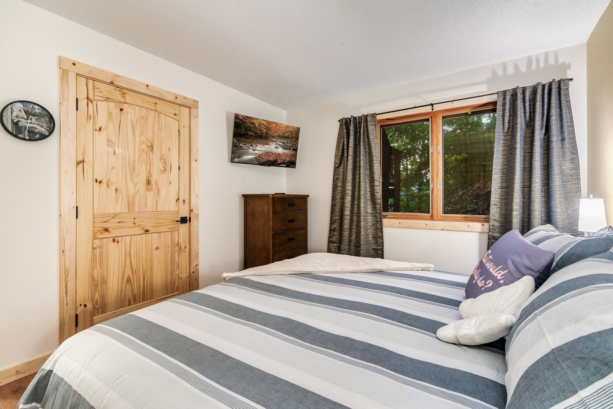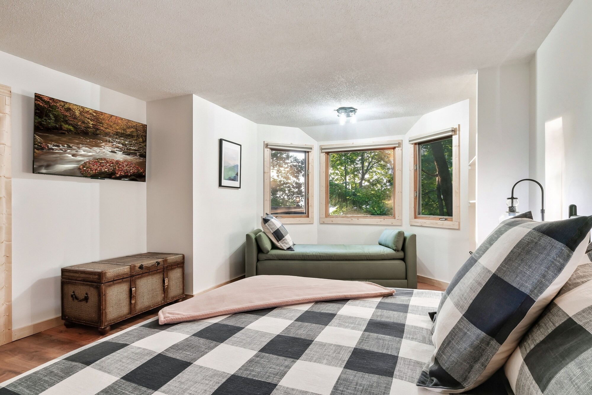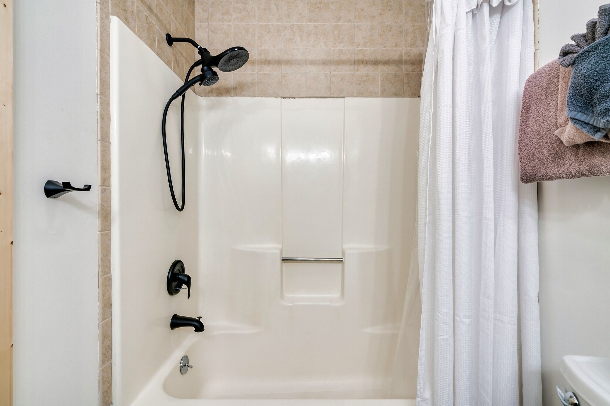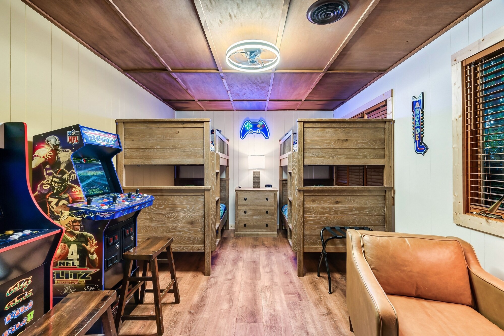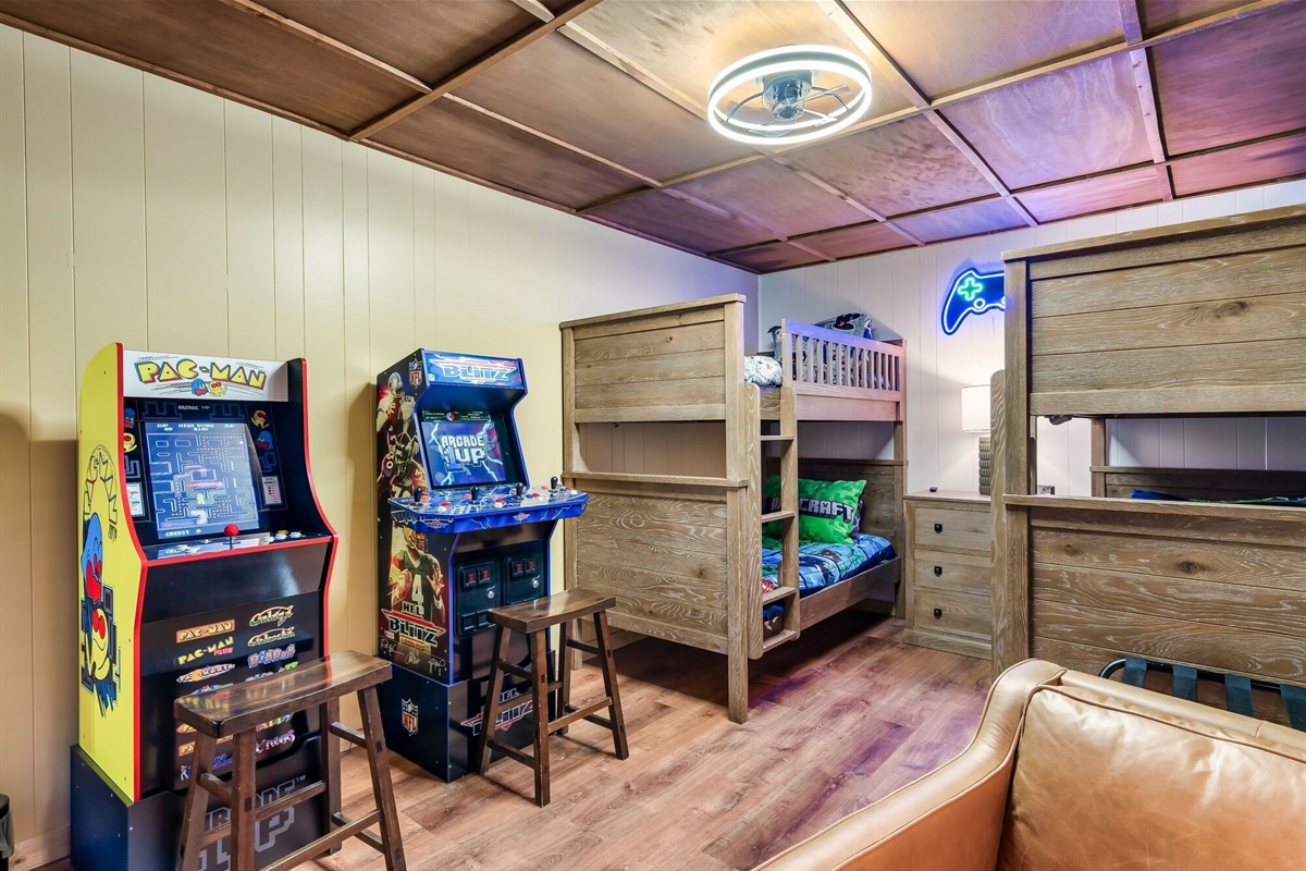 The lower level is designed with family needs in mind, featuring three bedrooms, including a kid-friendly room with two single beds and a 55" TV for gaming and streaming. A full bath with a shower-tub combination ensures convenience, while an additional half bath adds to the overall comfort.