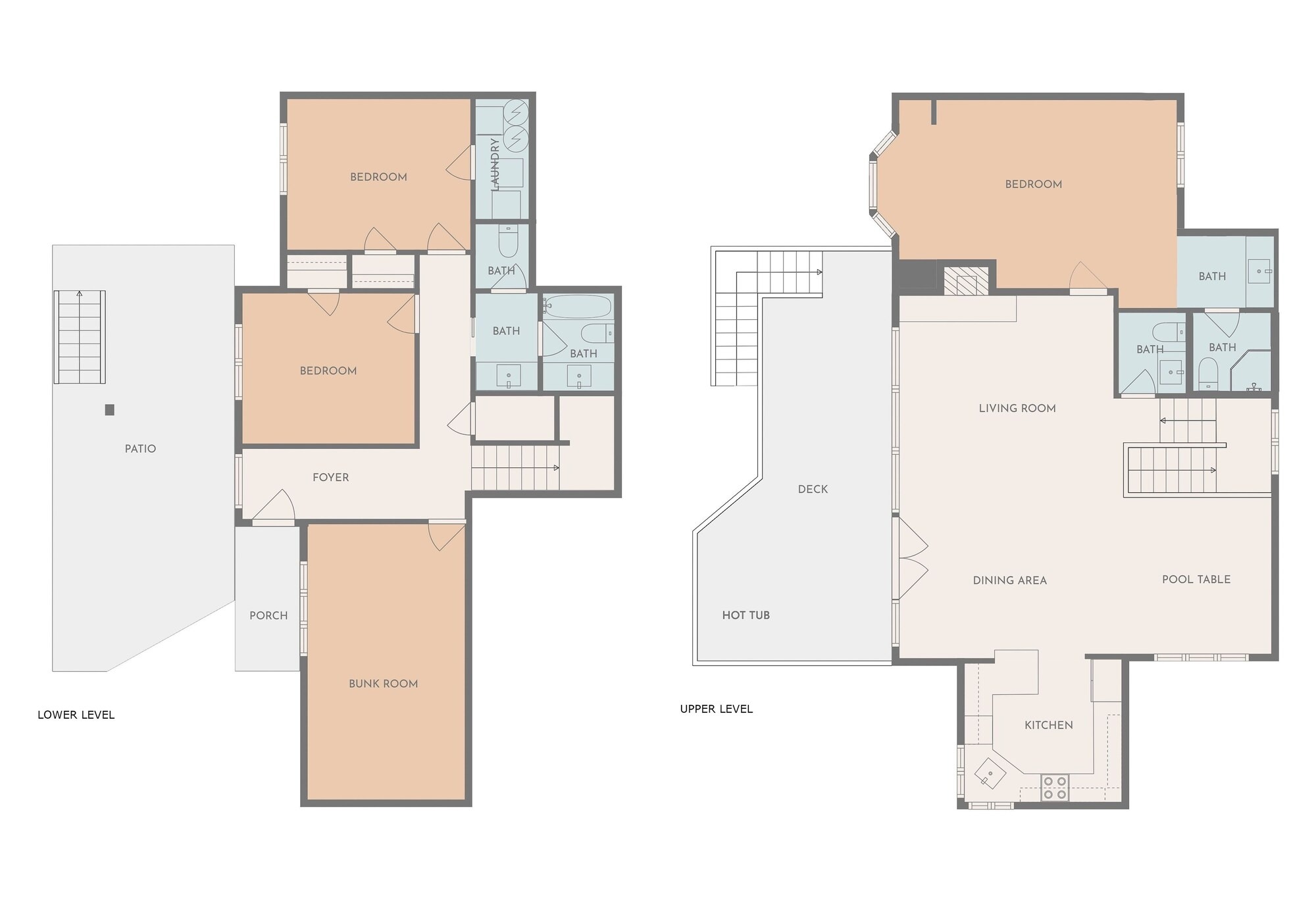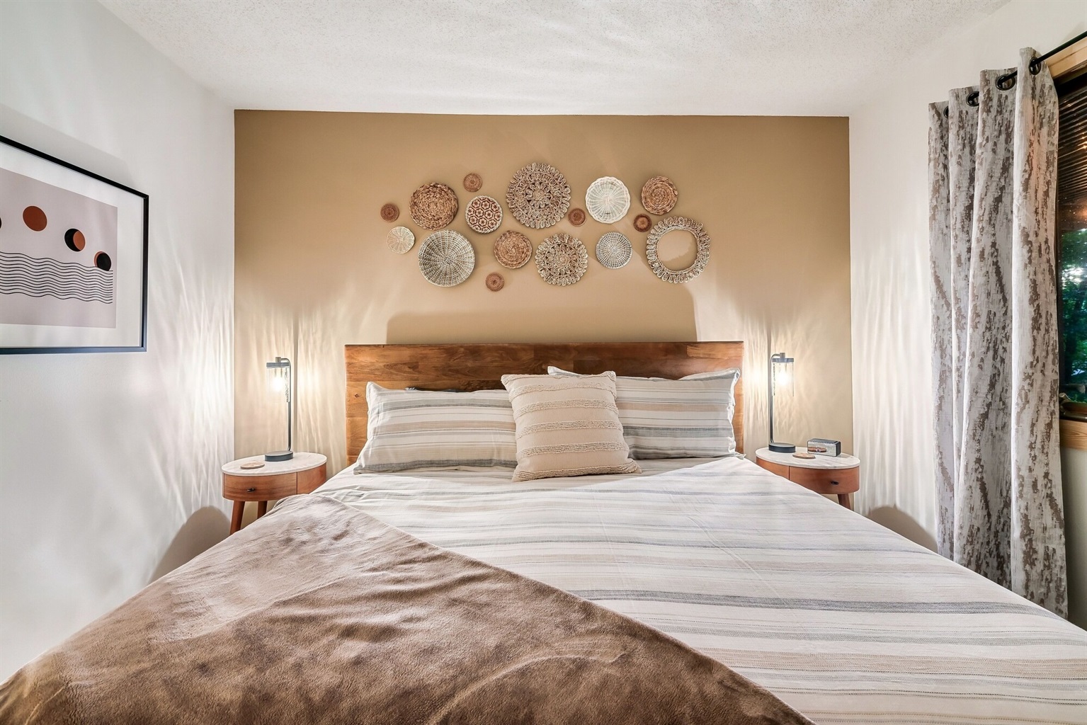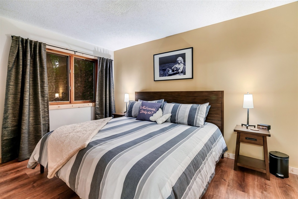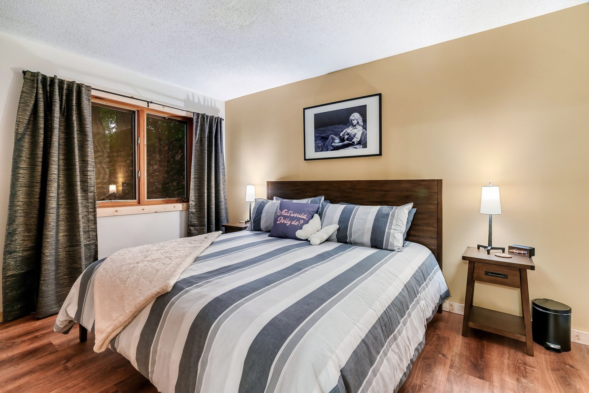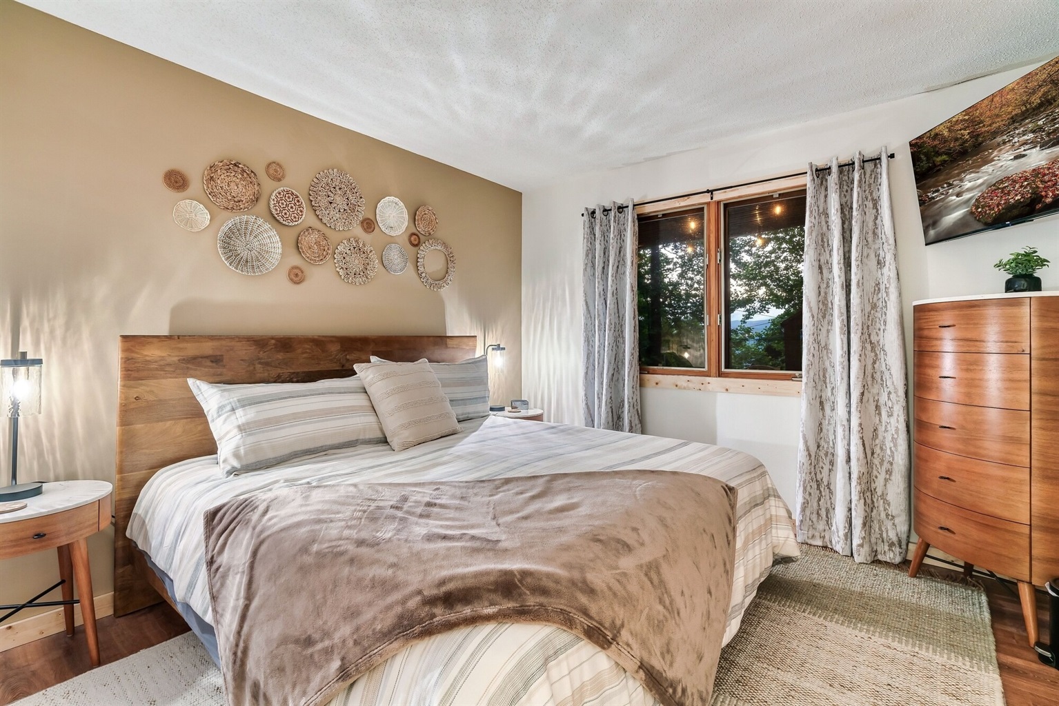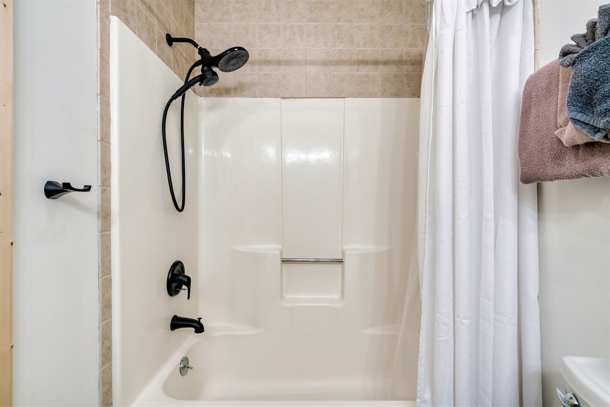 The lower level is designed with family needs in mind, featuring three bedrooms, including a kid-friendly room with two single beds and a 55" TV for gaming and streaming. A full bath with a shower-tub combination ensures convenience, while an additional half bath adds to the overall comfort.