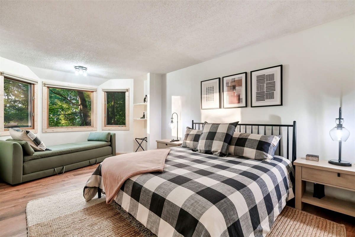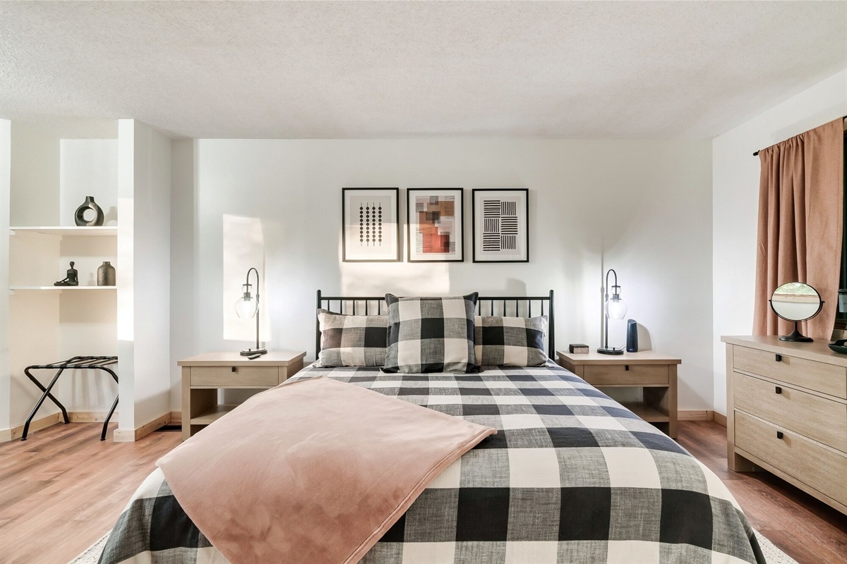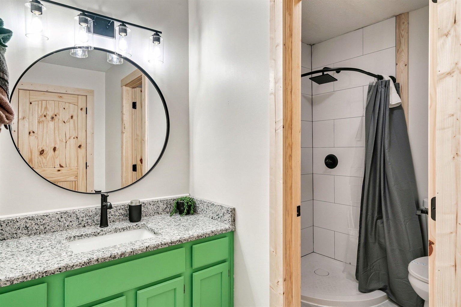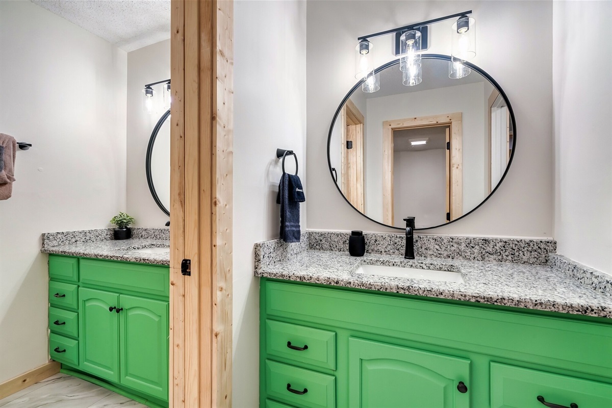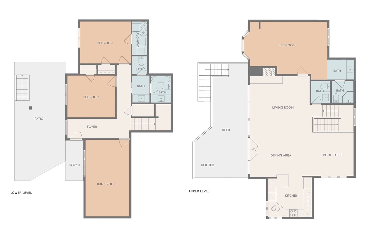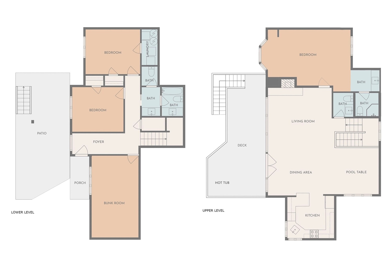 The lower level is designed with family needs in mind, featuring three bedrooms, including a kid-friendly room with two single beds and a 55" TV for gaming and streaming. A full bath with a shower-tub combination ensures convenience, while an additional half bath adds to the overall comfort.