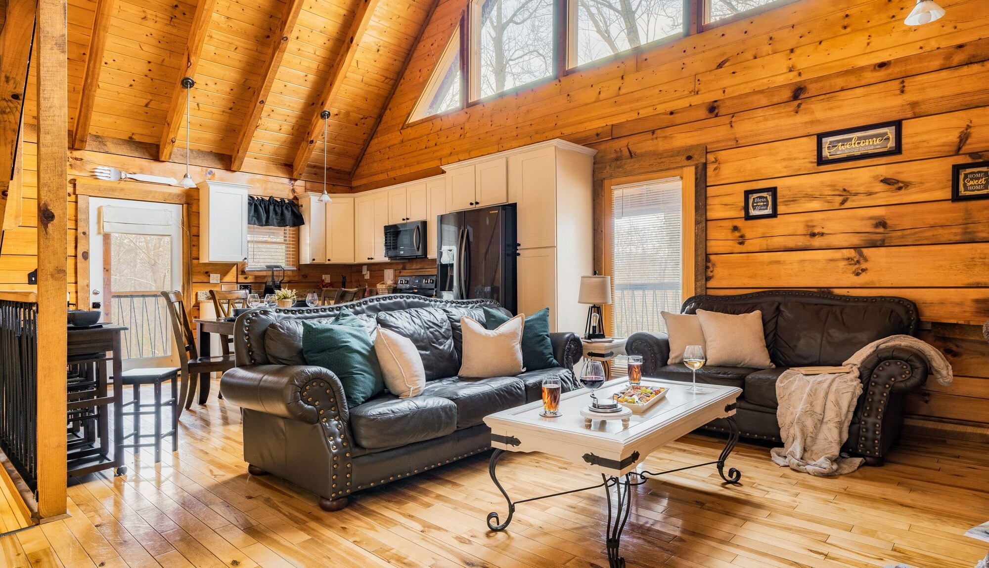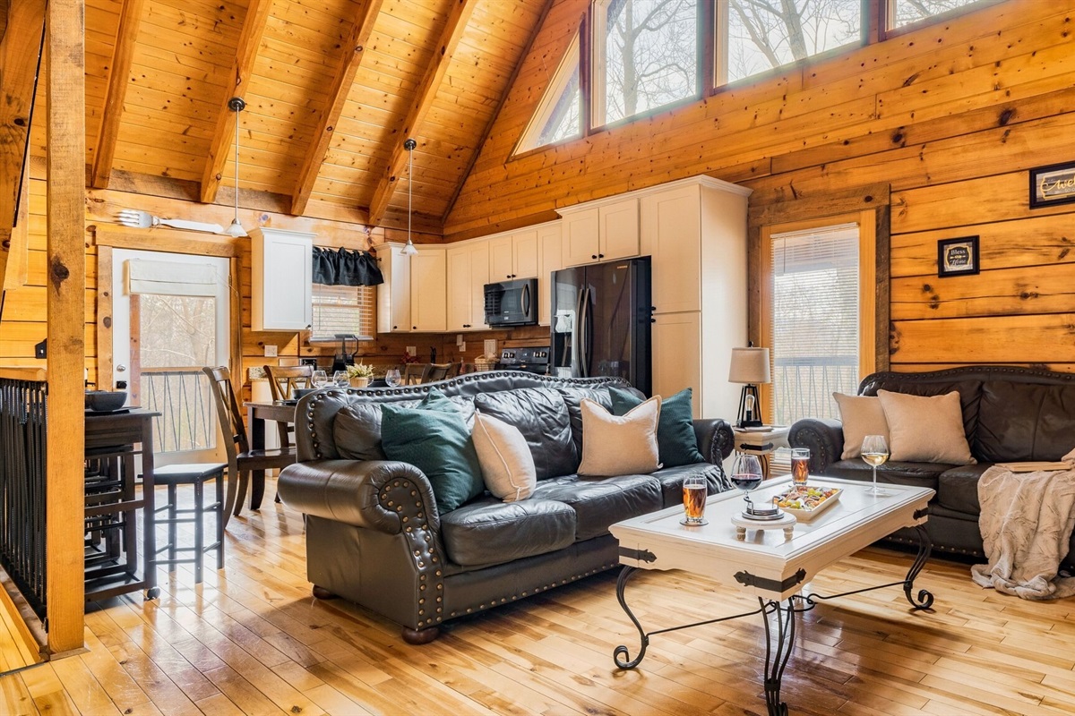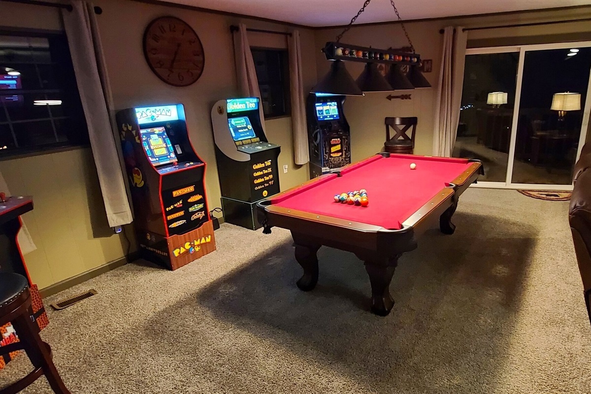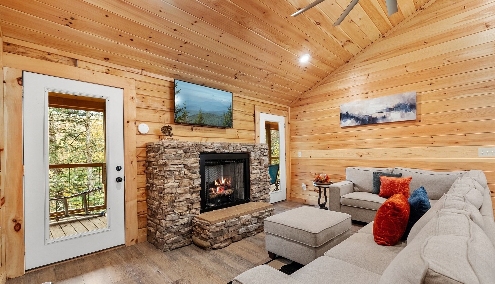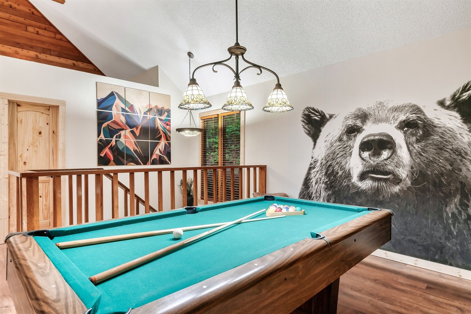Step into family fun as you enter the upper level, featuring a massive great room adorned with vaulted ceilings and exposed beams. Enjoy quality time around the wood-burning fireplace, shoot a game of pool, or gather for a family movie night on the impressive 75" smart TV. The dining area provides a perfect setting for festive meals, and a convenient half bath adds to the comfort.