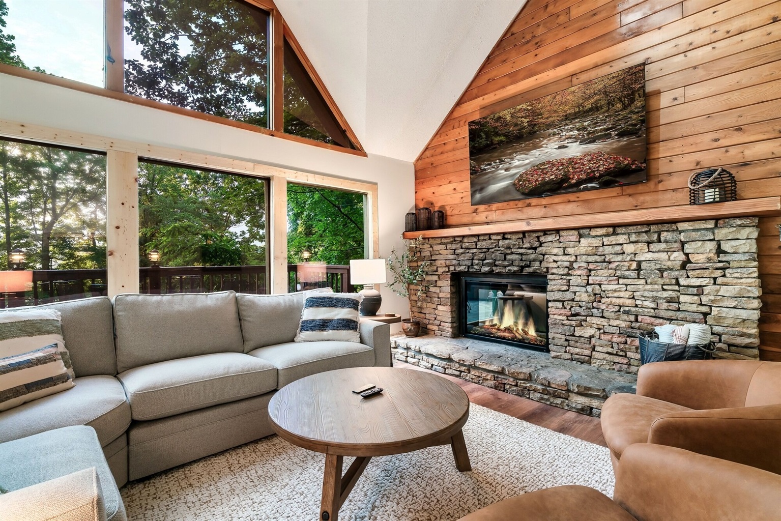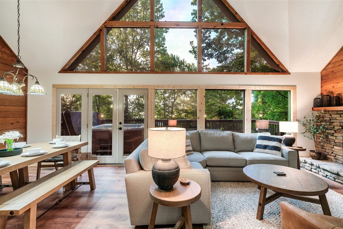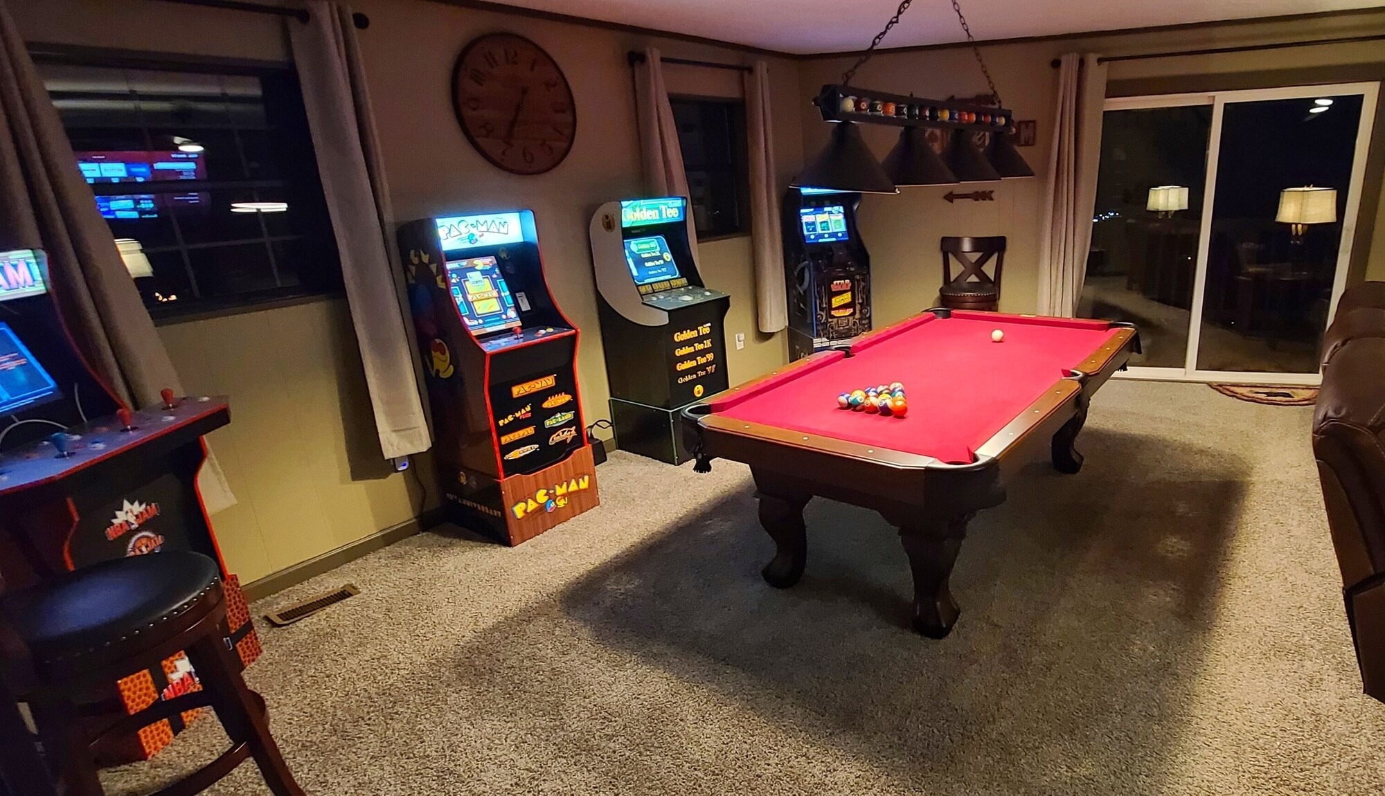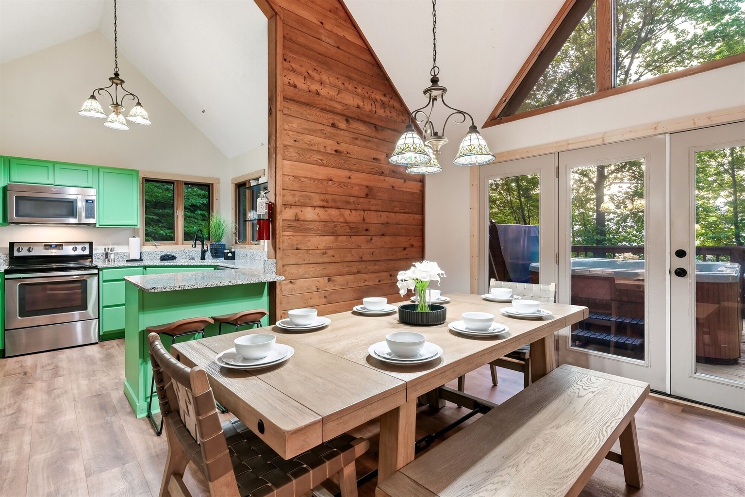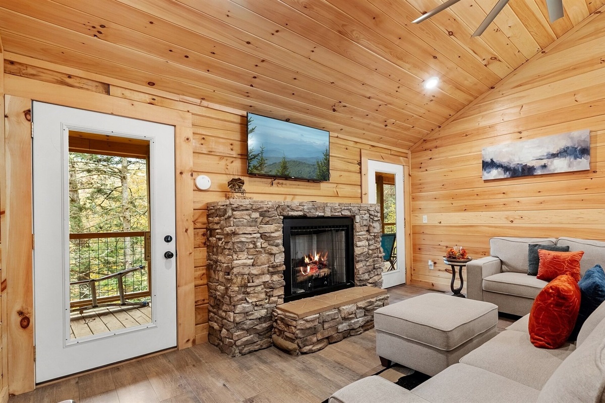 Step into family fun as you enter the upper level, featuring a massive great room adorned with vaulted ceilings and exposed beams. Enjoy quality time around the wood-burning fireplace, shoot a game of pool, or gather for a family movie night on the impressive 75" smart TV. The dining area provides a perfect setting for festive meals, and a convenient half bath adds to the comfort.