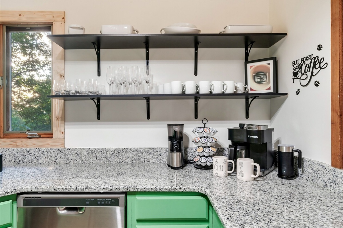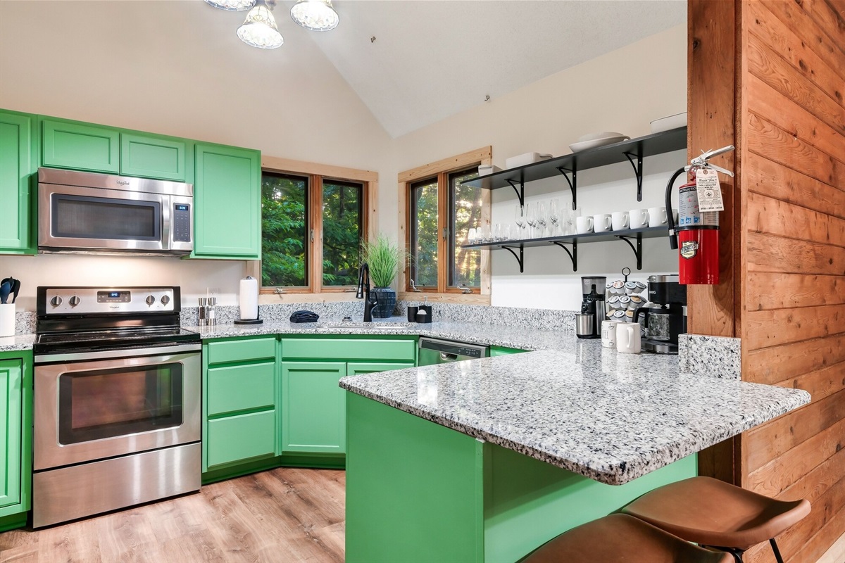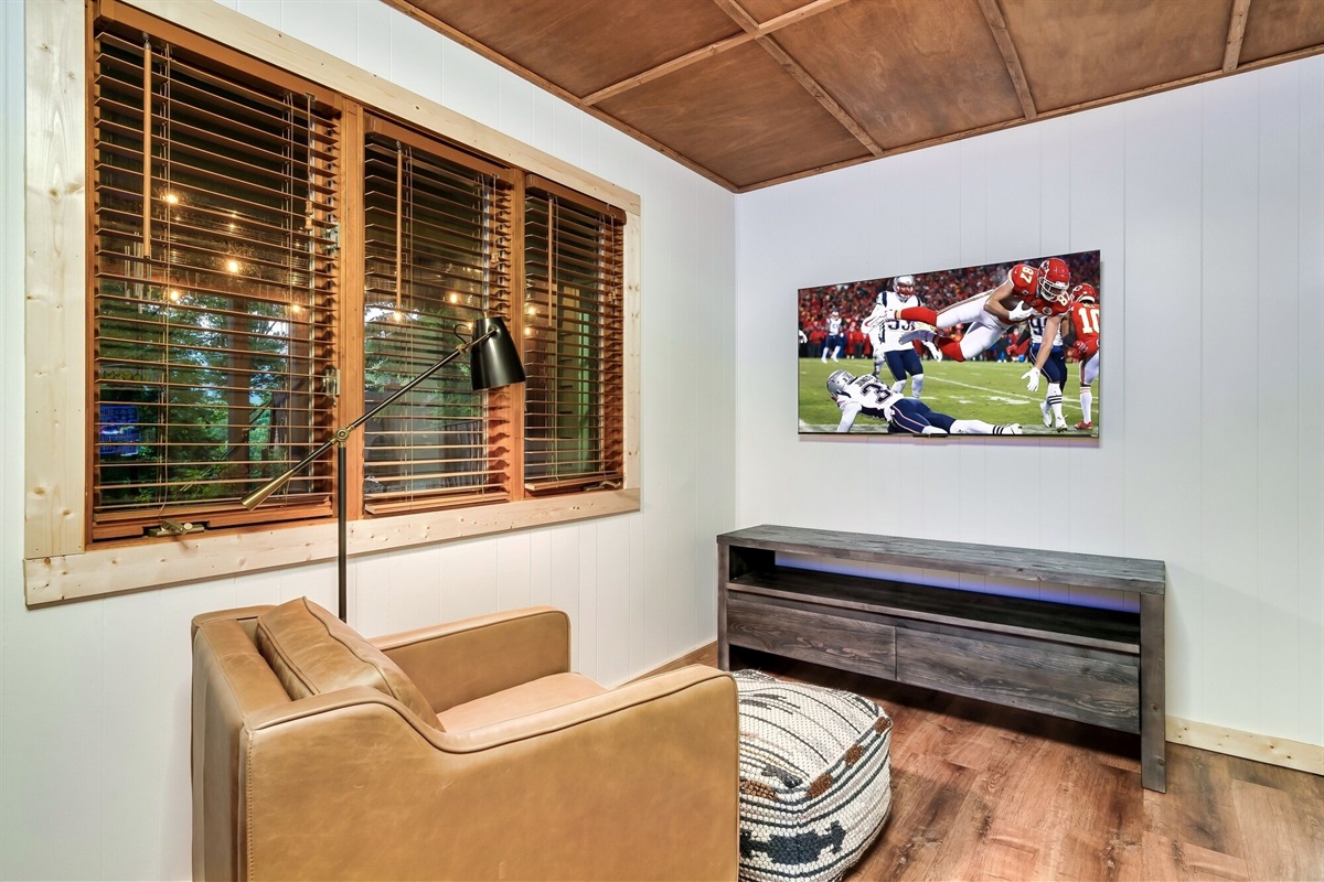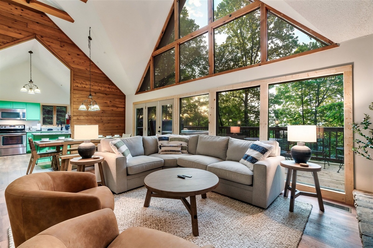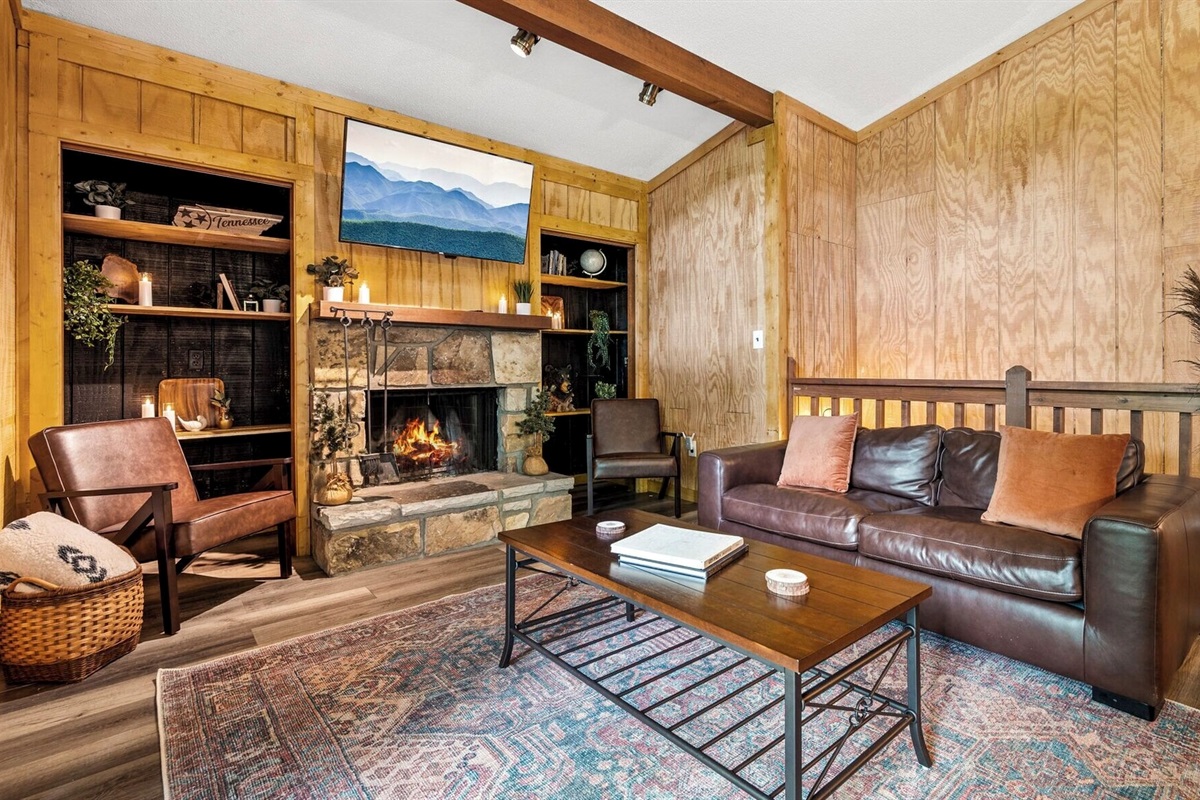 Step into family fun as you enter the upper level, featuring a massive great room adorned with vaulted ceilings and exposed beams. Enjoy quality time around the wood-burning fireplace, shoot a game of pool, or gather for a family movie night on the impressive 75" smart TV. The dining area provides a perfect setting for festive meals, and a convenient half bath adds to the comfort.