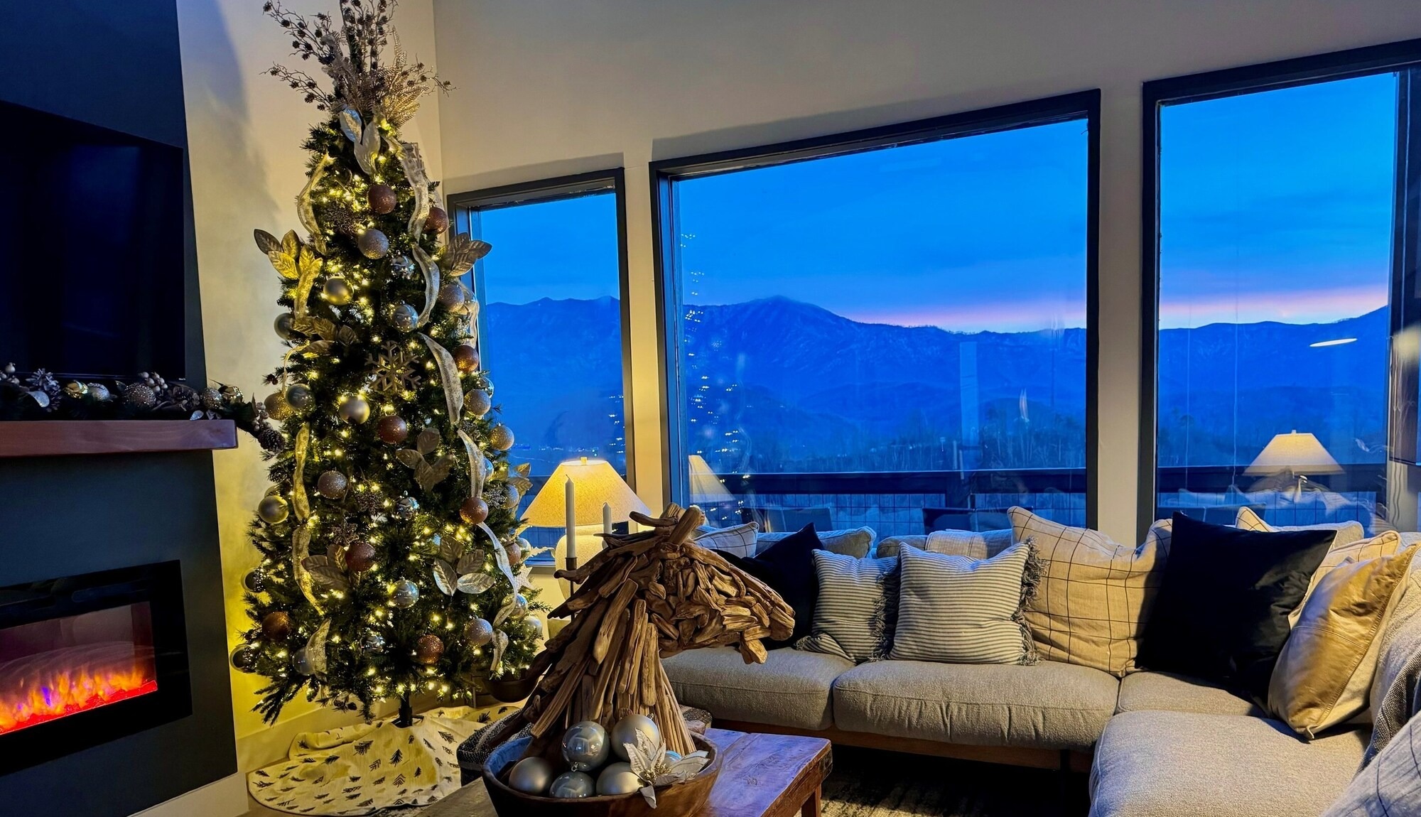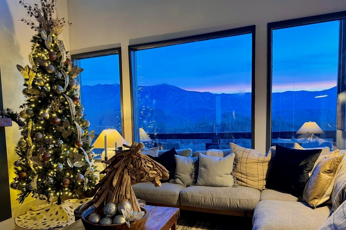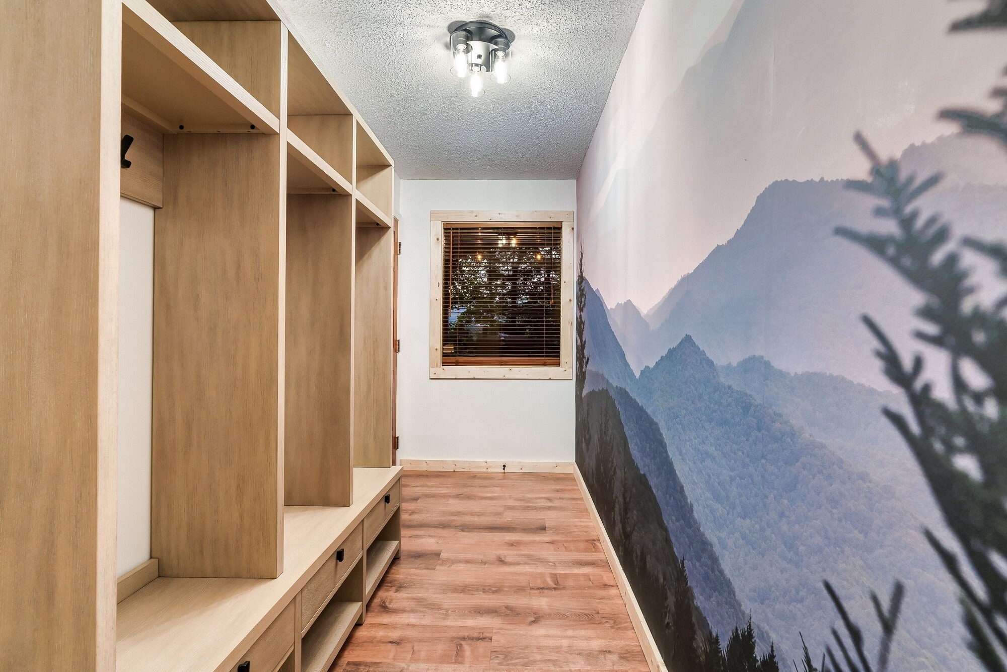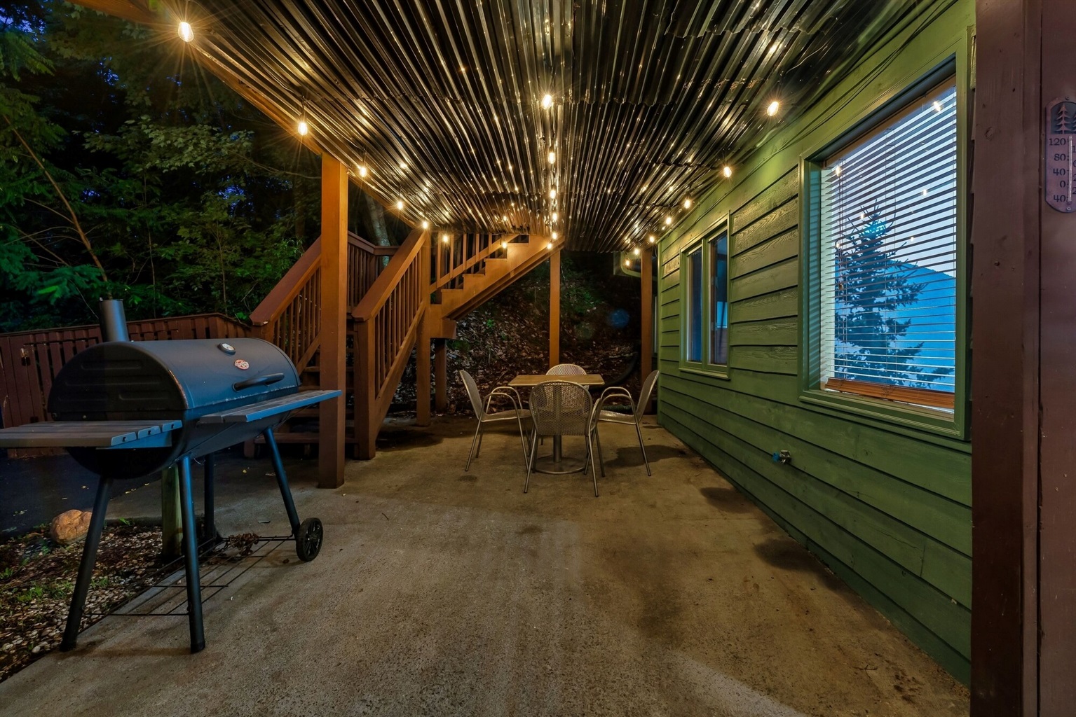 The covered patio on the lower level leads to a spacious driveway with parking for up to 5 cars, ensuring everyone in your large group has easy access to this mountain retreat.