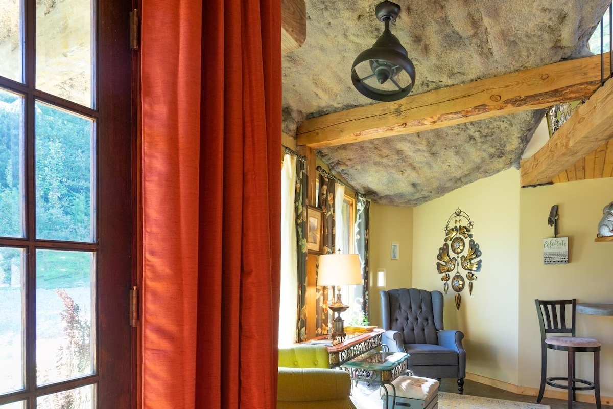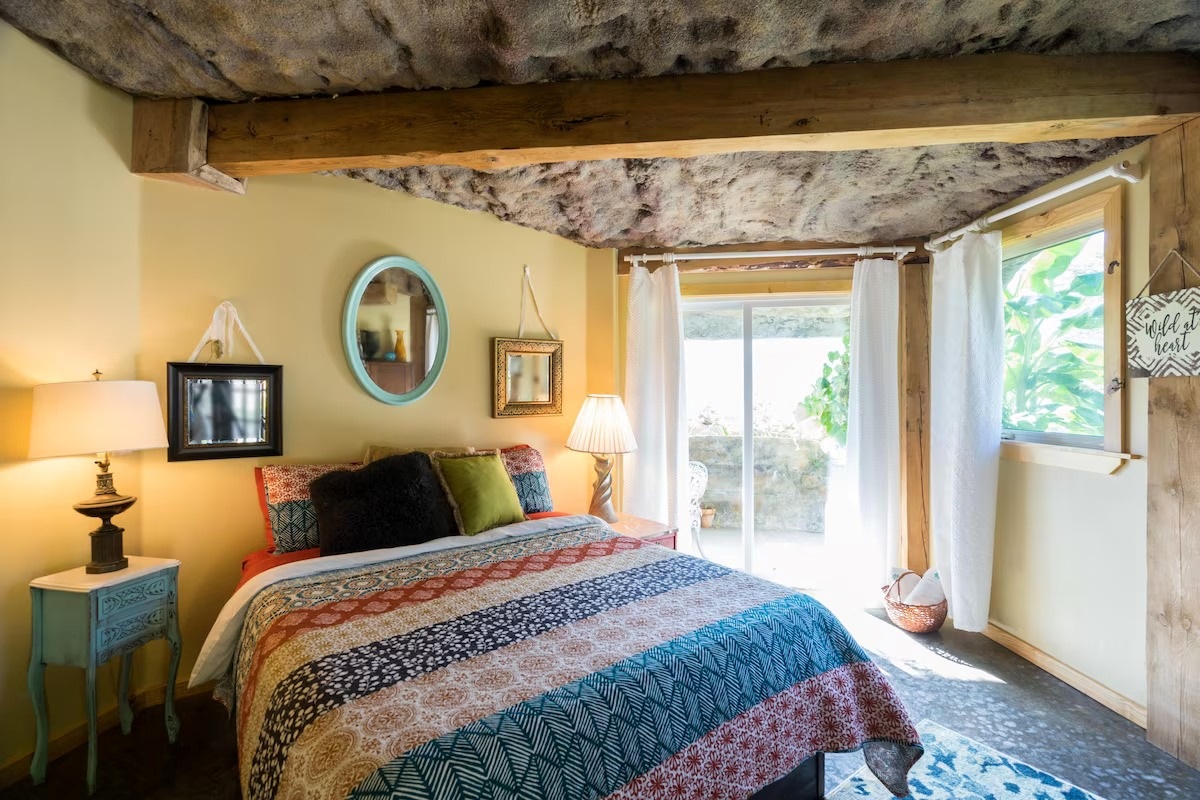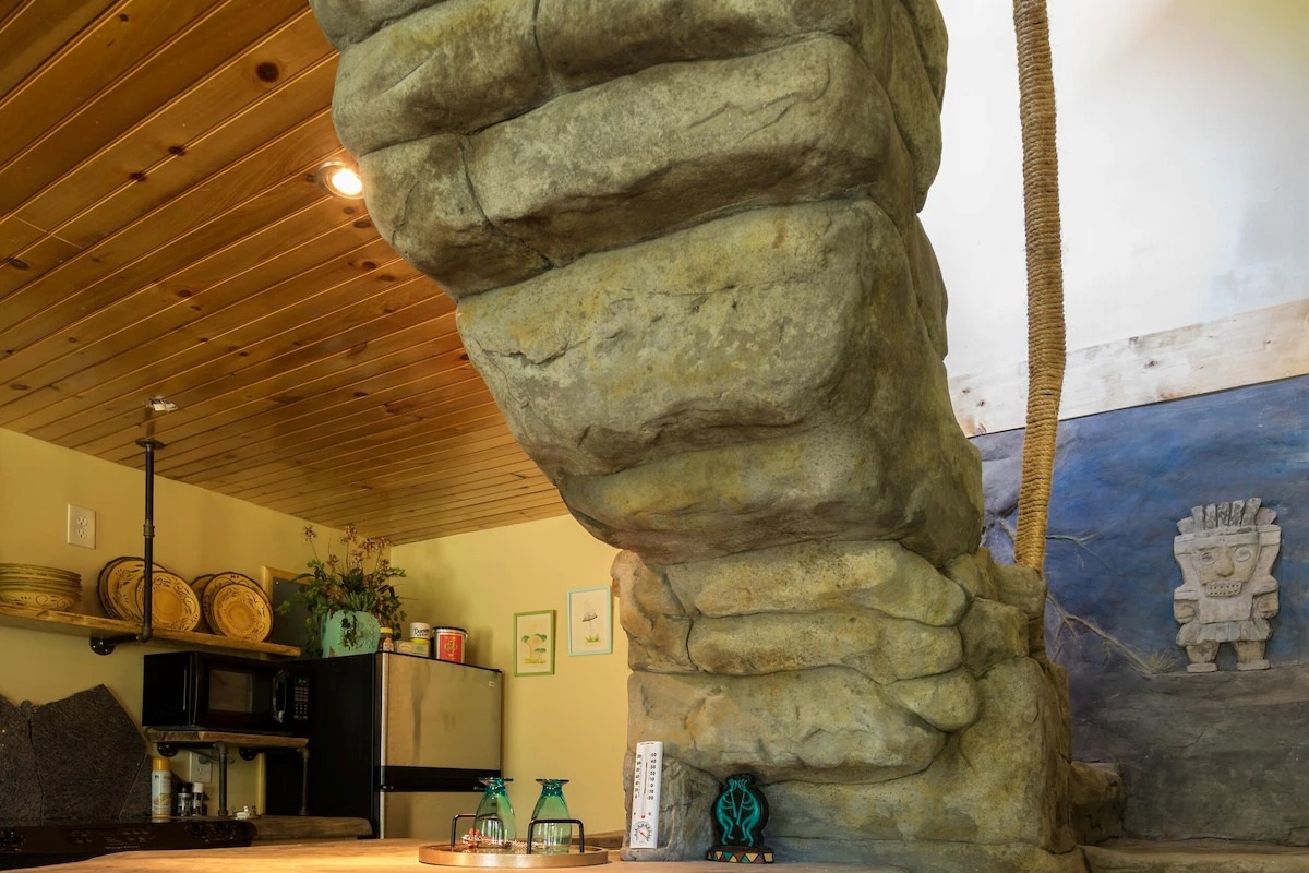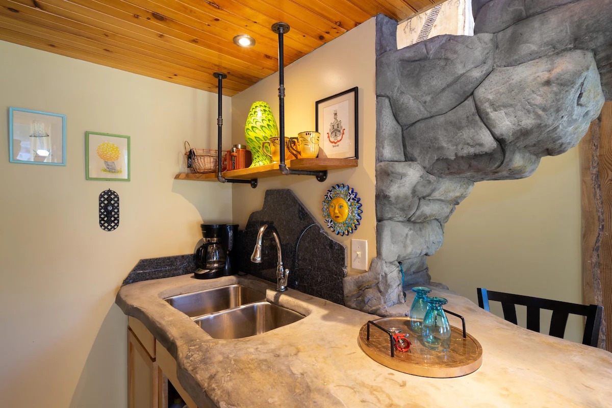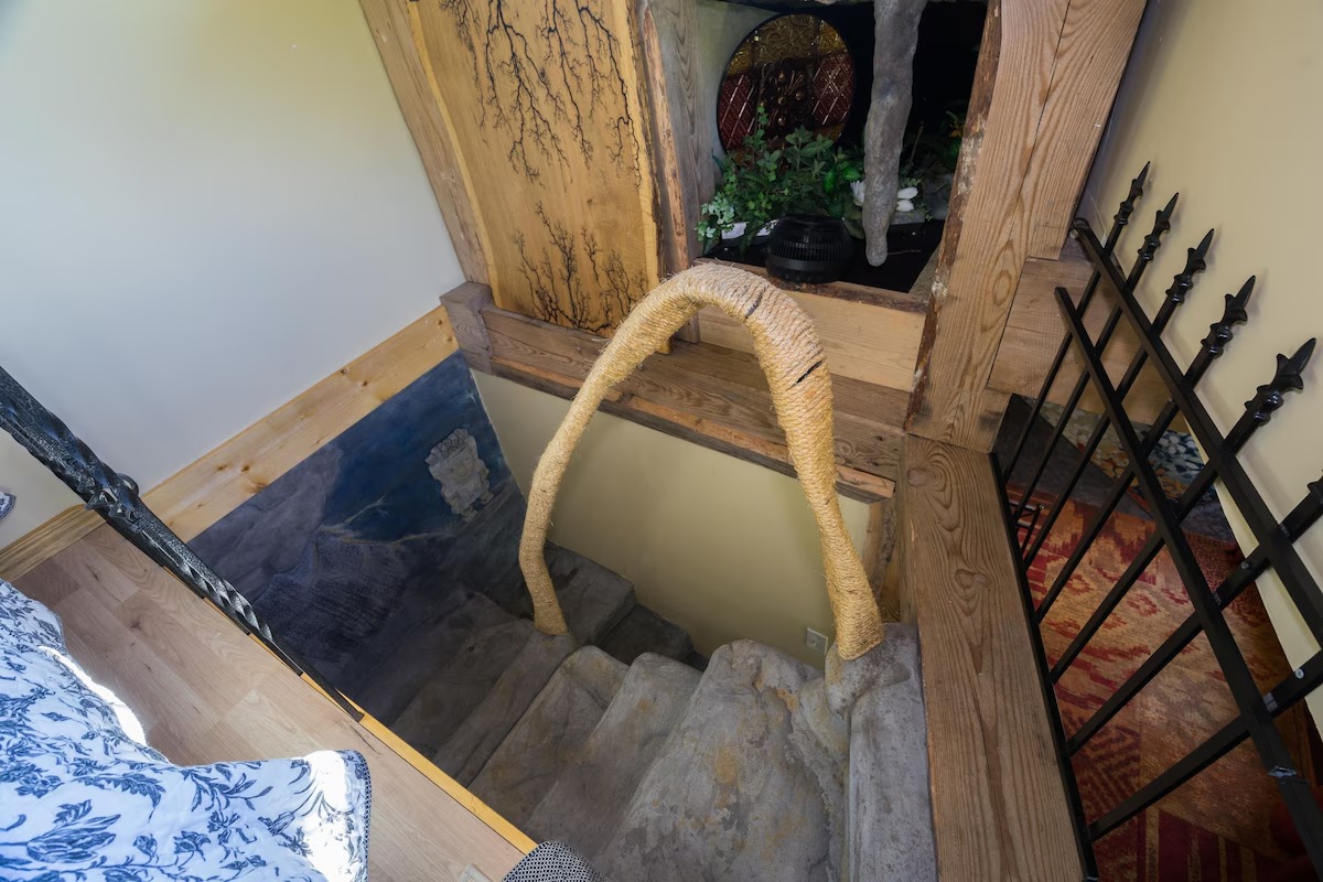 This hand-carved stone cottage has a ruins-like exterior and continues the theme as you go inside. Its well decorated cavern interior will wow you with its thoughtful layout and interesting construction technique.