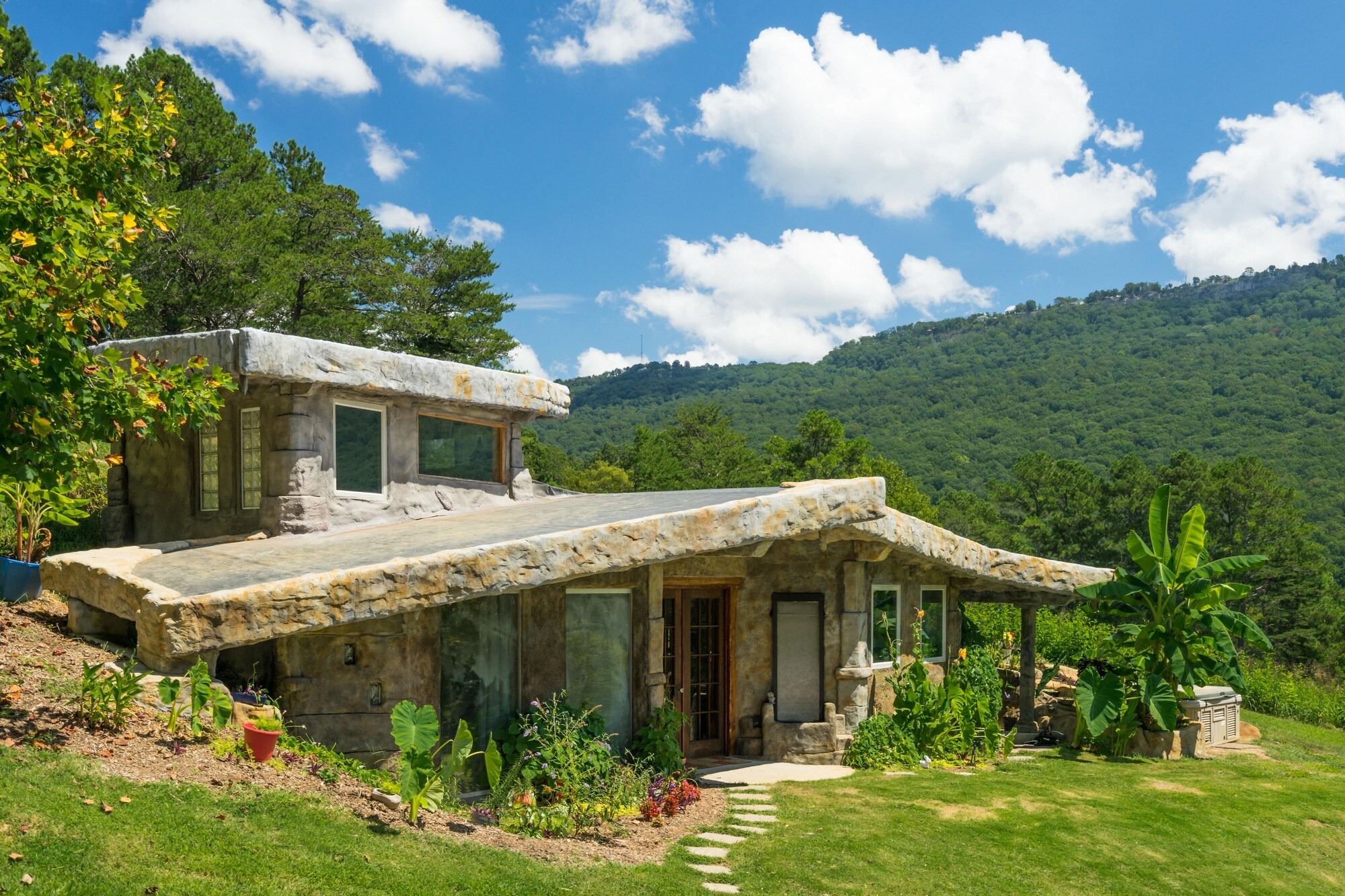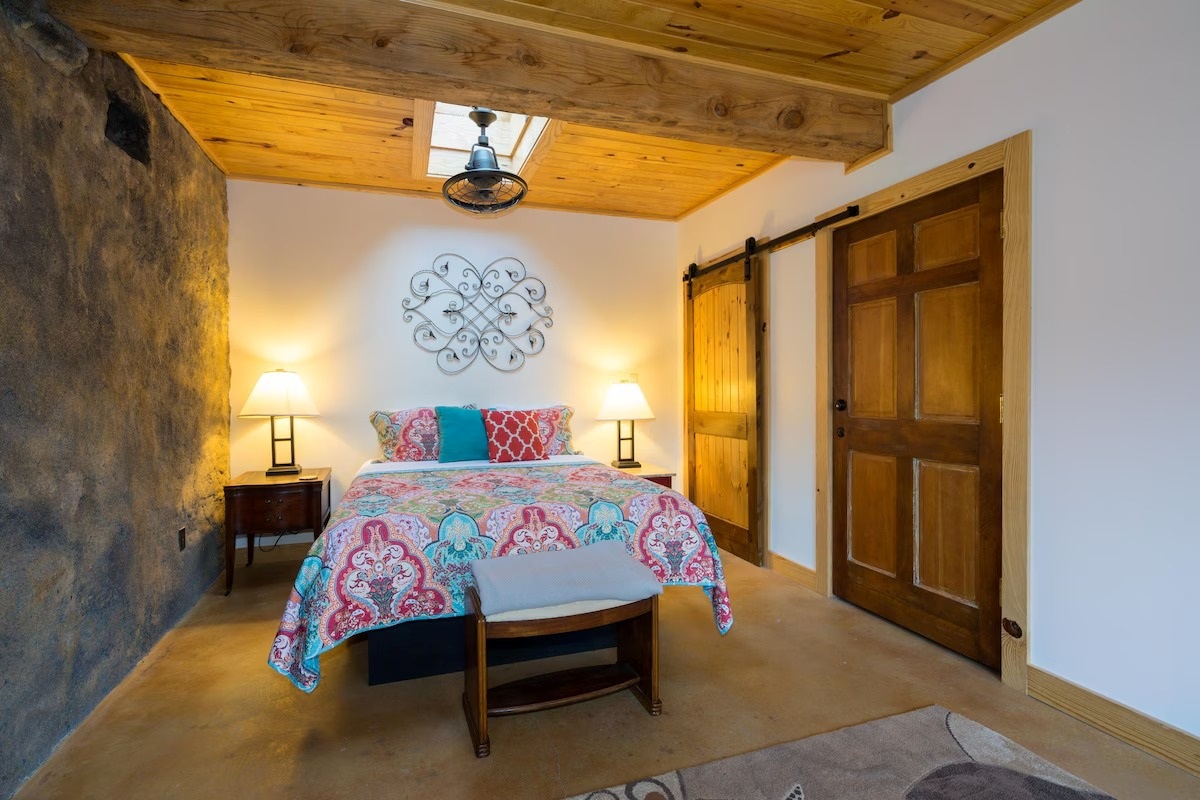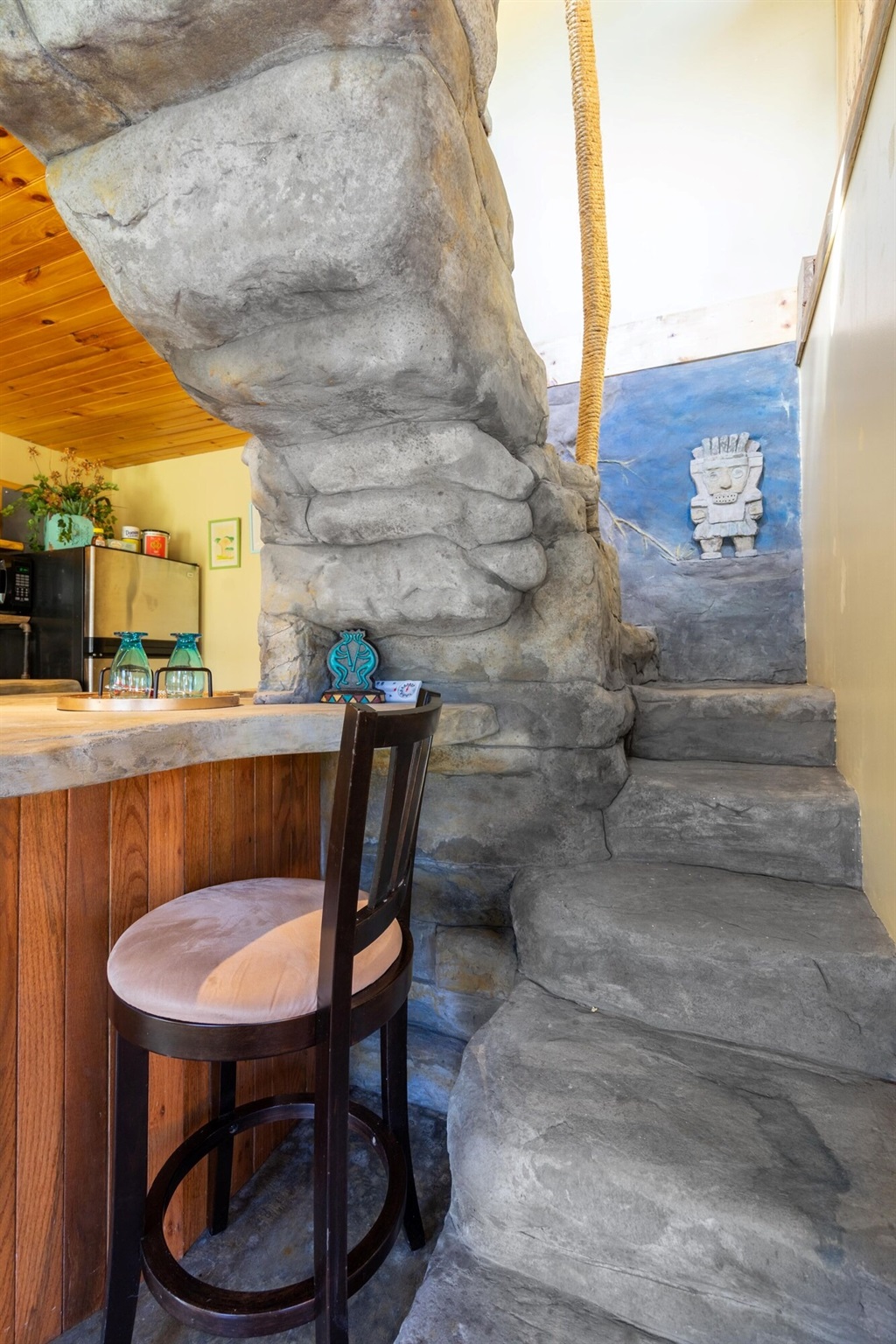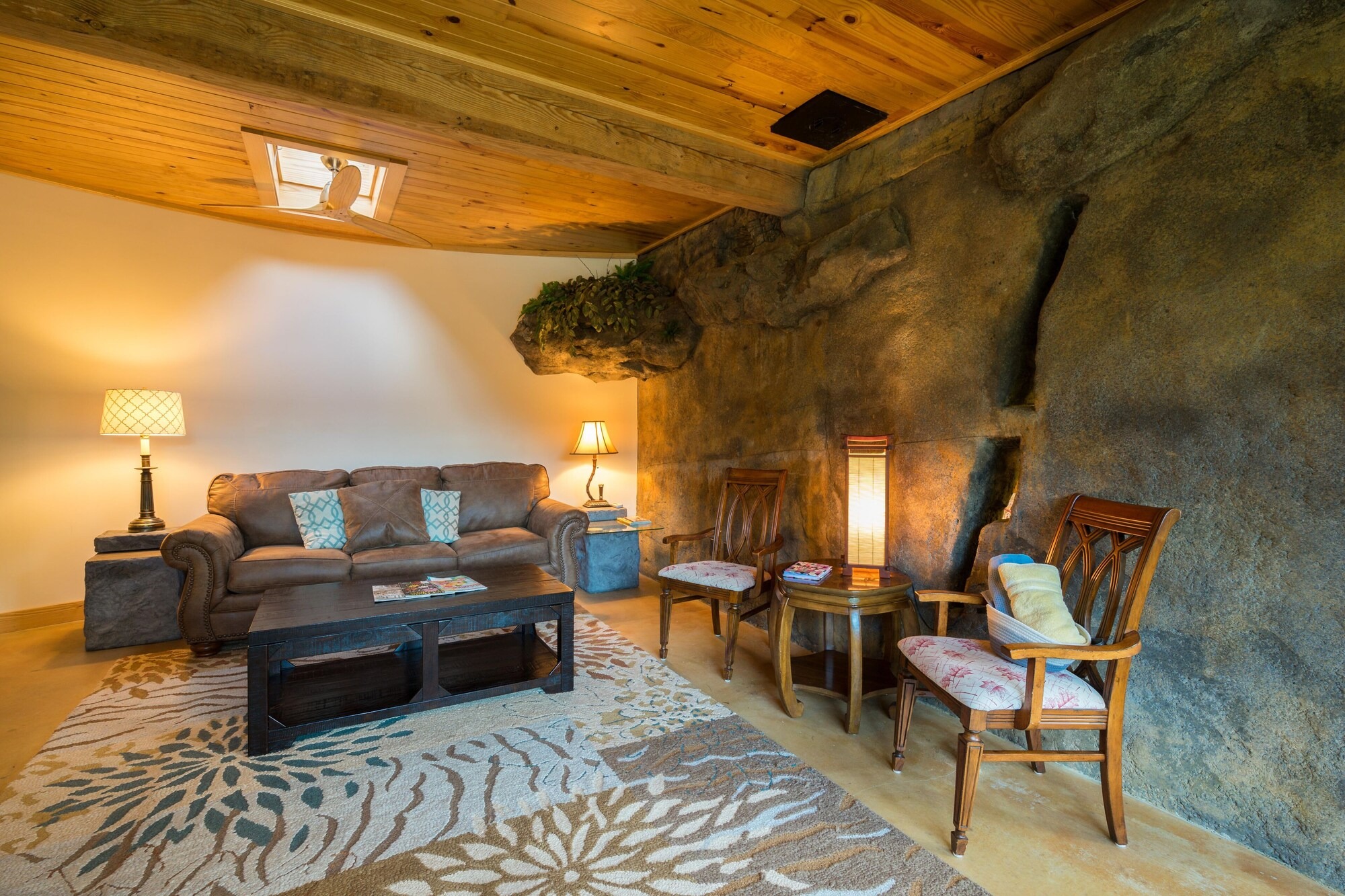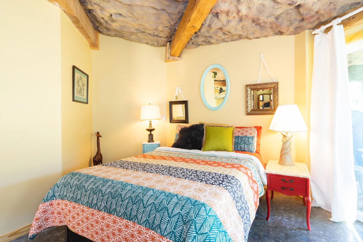 This hand-carved stone cottage has a ruins-like exterior and continues the theme as you go inside. Its well decorated cavern interior will wow you with its thoughtful layout and interesting construction technique.