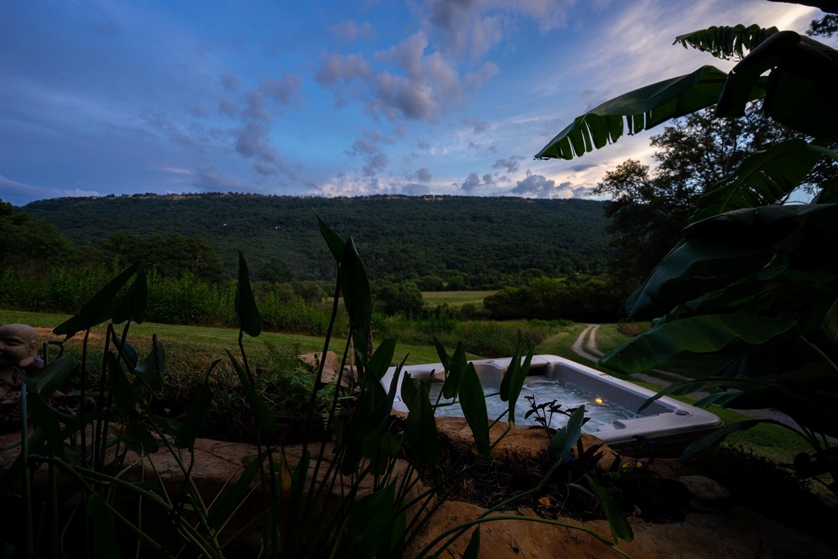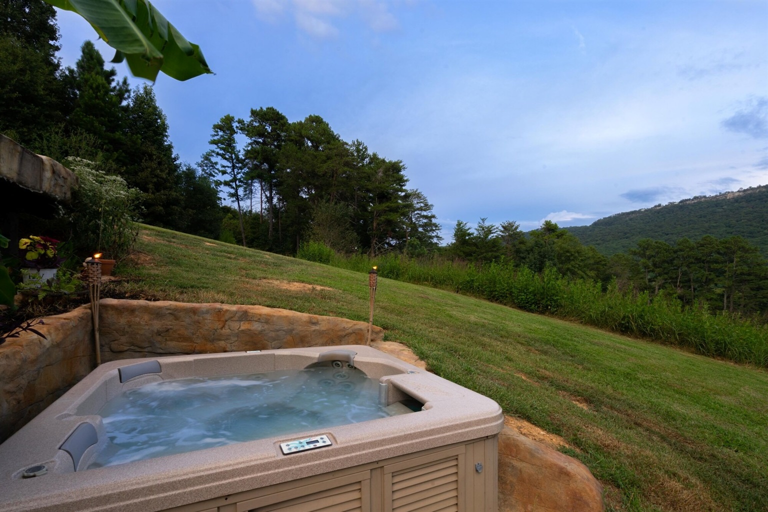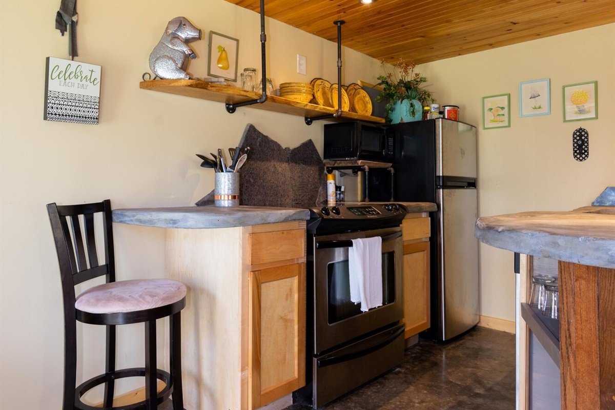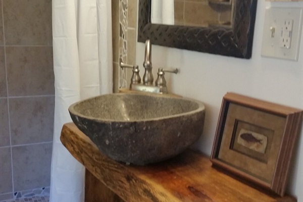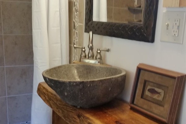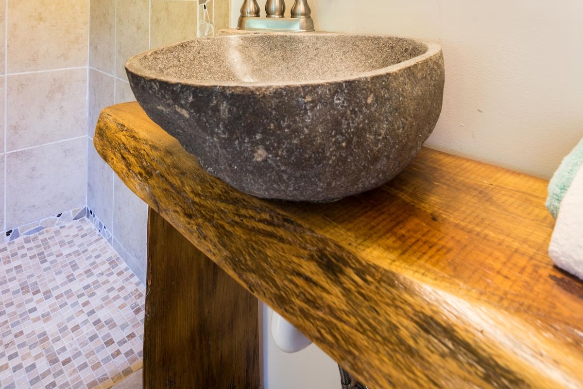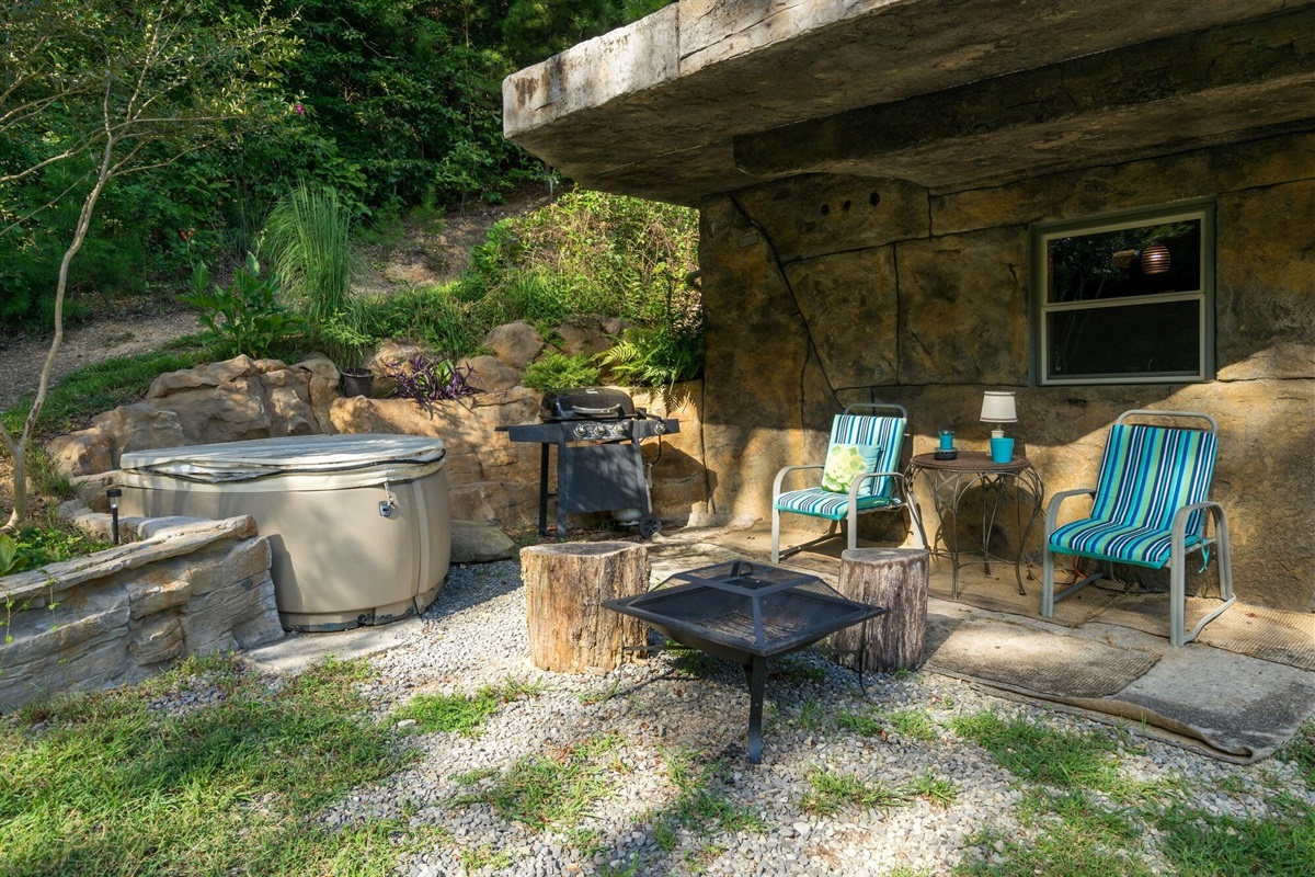 This hand-carved, artful cottage has a charming interior and large windows framing scenic views of Lookout Mountain. Inside, you'll find wood ceilings, a huge stone center wall, a full kitchen, and a spa-inspired bathroom with a stone sink and a large tile and stone shower. A queen size bed in the bedroom and a queen size sleeper sofa in the living room provide ample sleeping space for up to four guests. Outside there is a hot tub, fire pit and covered outdoor seating where you can hang out and enjoy the scenery.
