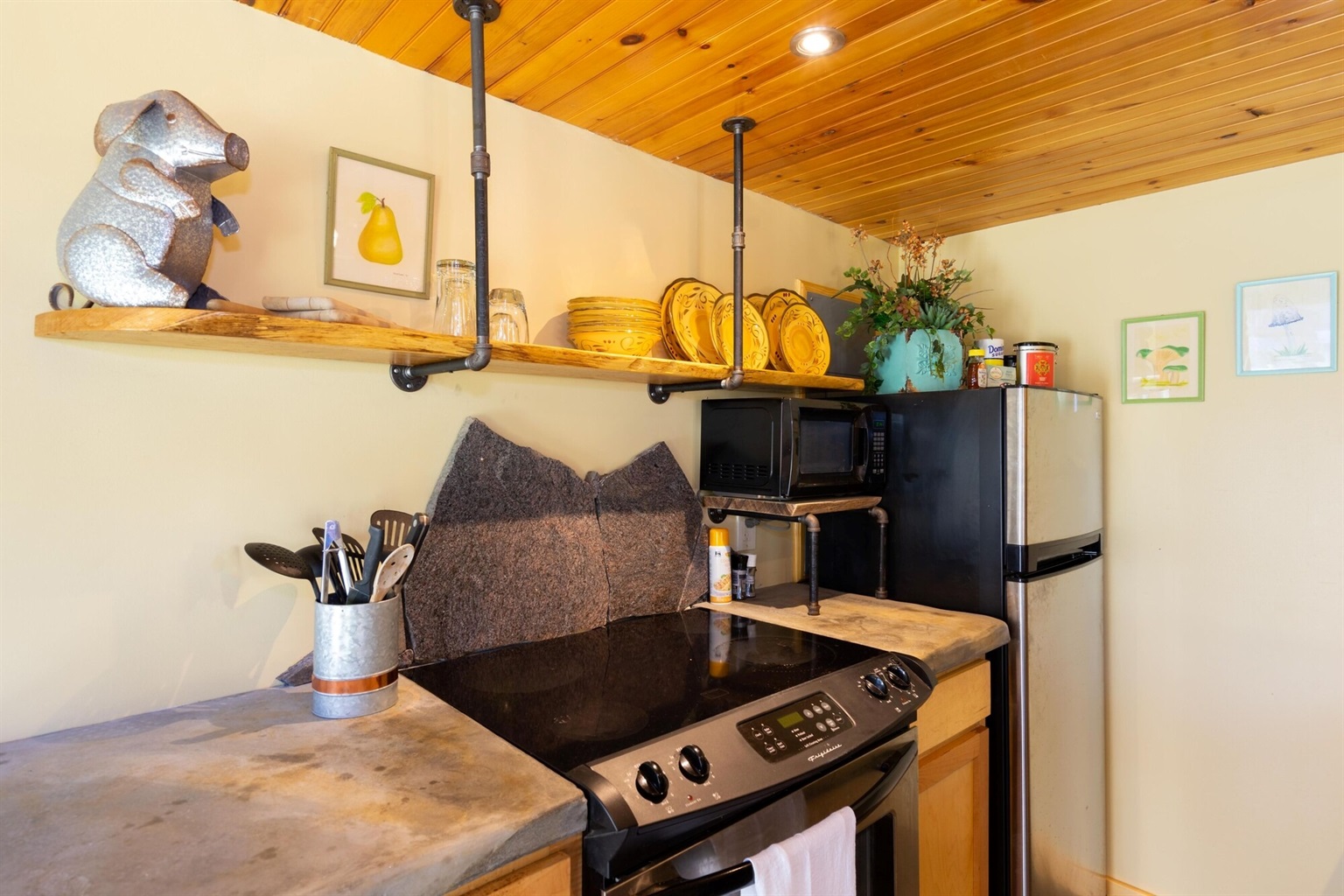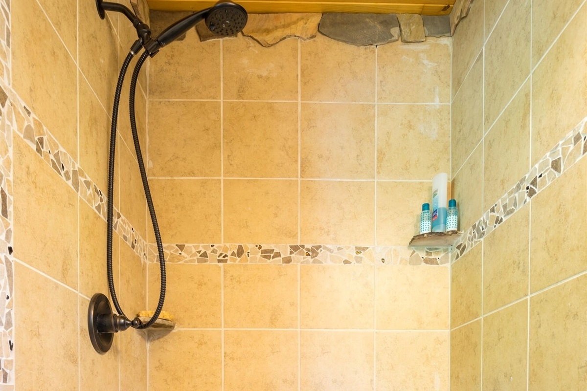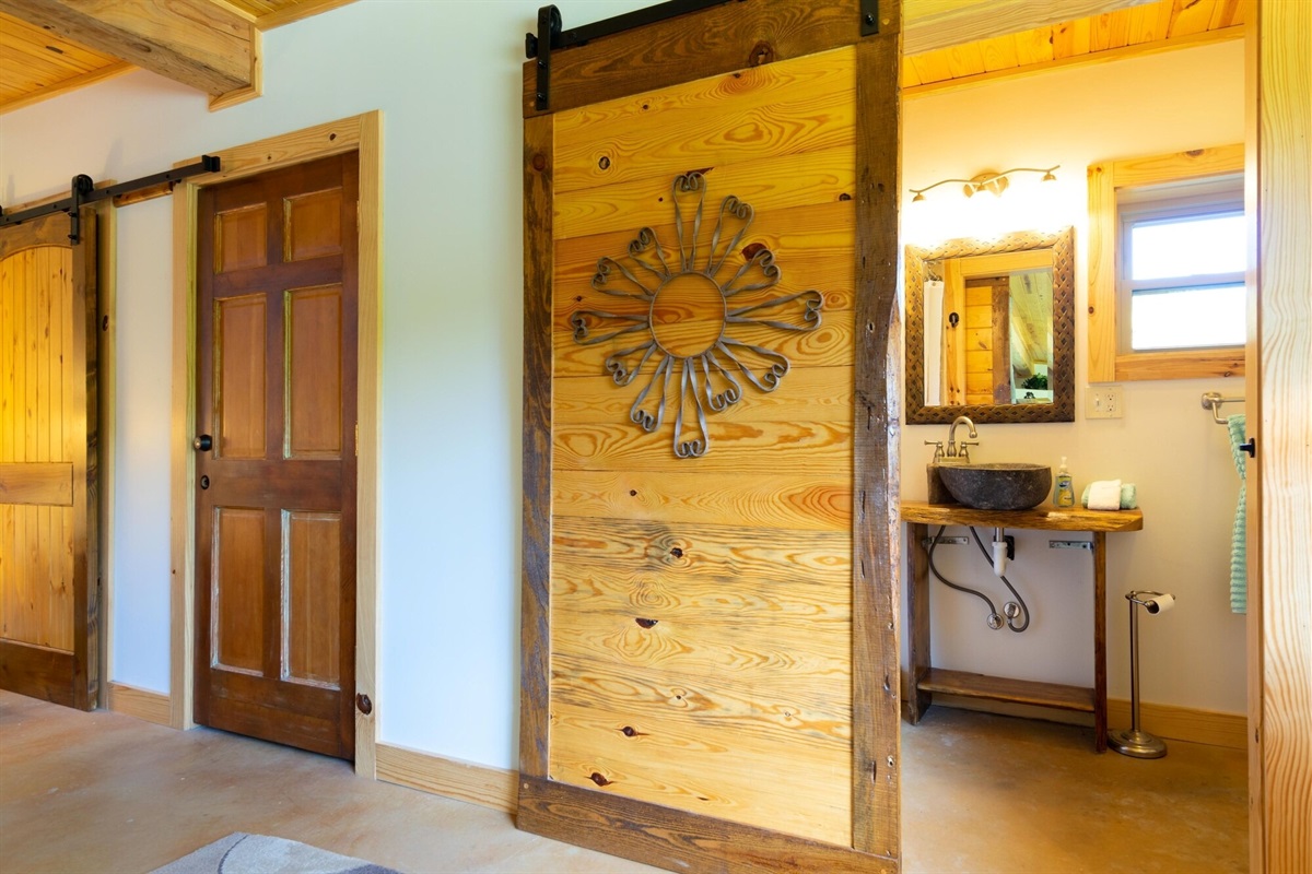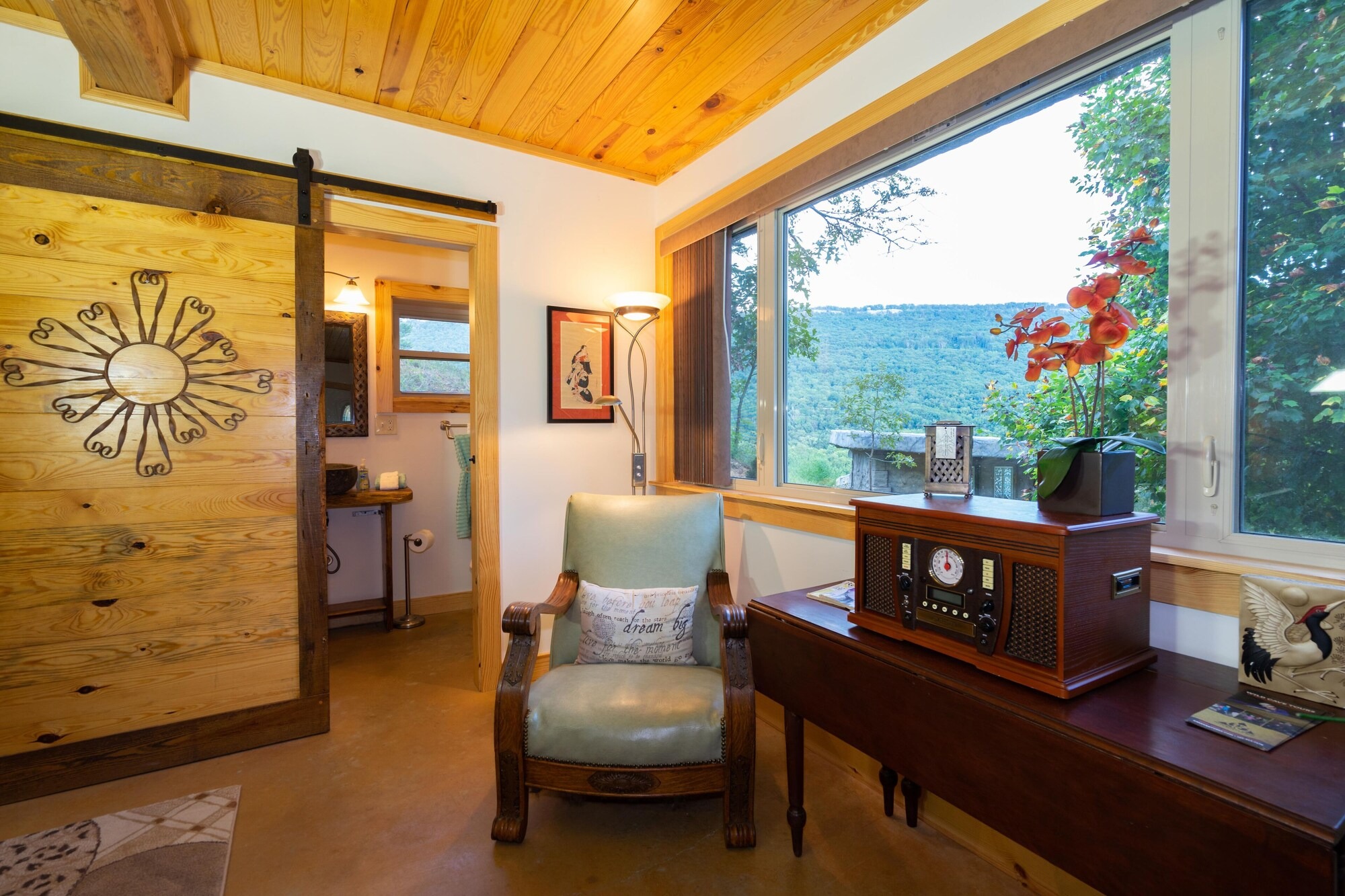 This hand-carved, artful cottage has a charming interior and large windows framing scenic views of Lookout Mountain. Inside, you'll find wood ceilings, a huge stone center wall, a full kitchen, and a spa-inspired bathroom with a stone sink and a large tile and stone shower. A queen size bed in the bedroom and a queen size sleeper sofa in the living room provide ample sleeping space for up to four guests. Outside there is a hot tub, fire pit and covered outdoor seating where you can hang out and enjoy the scenery.