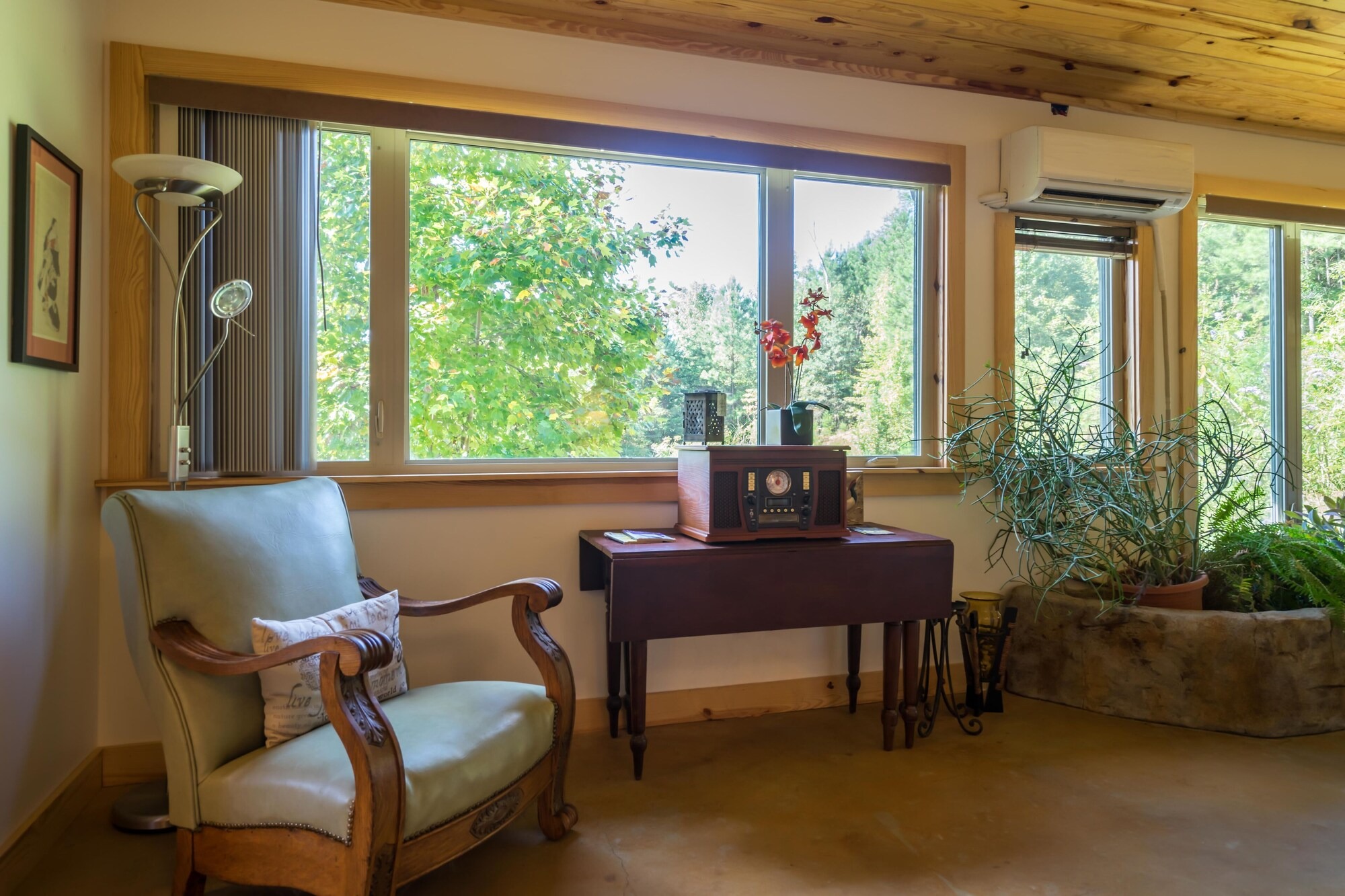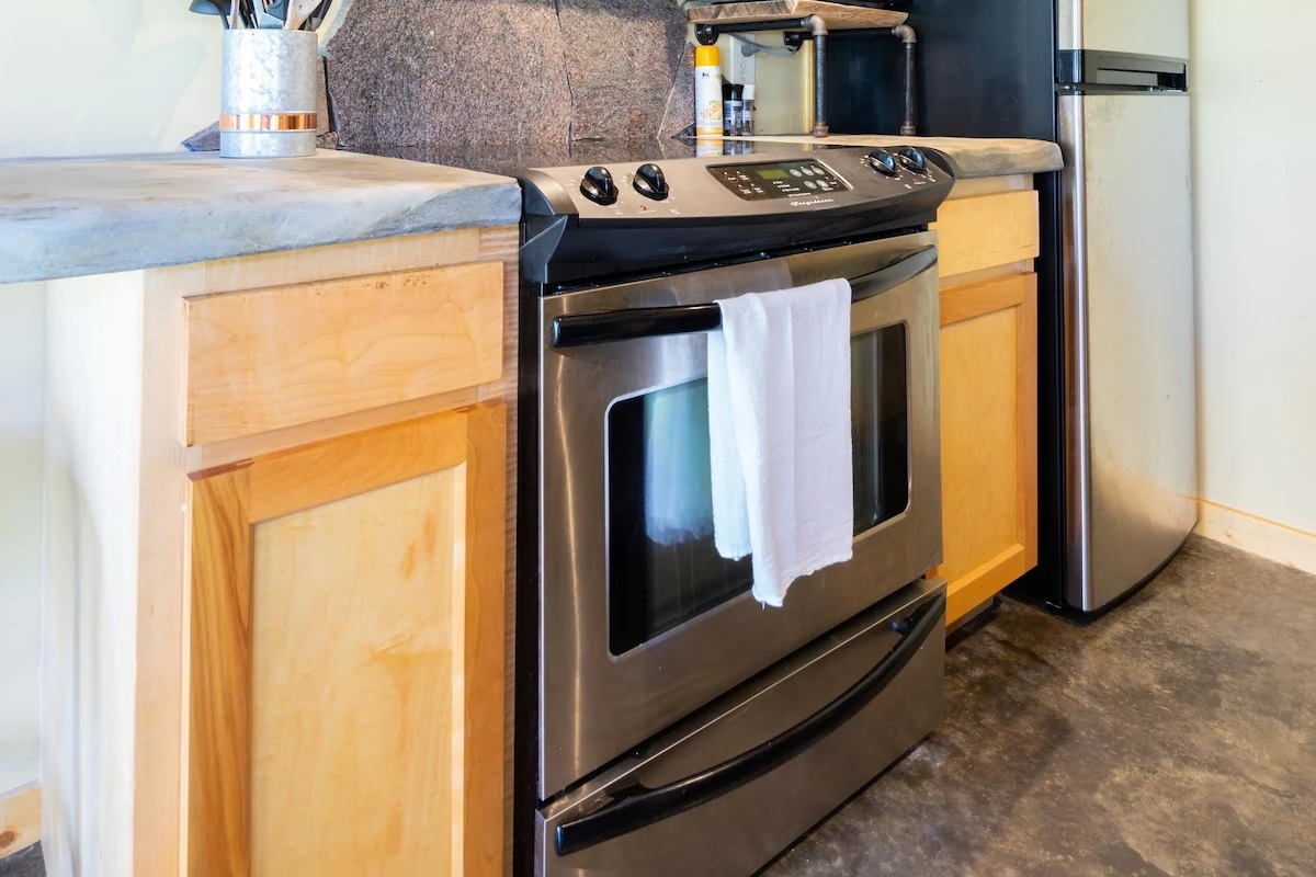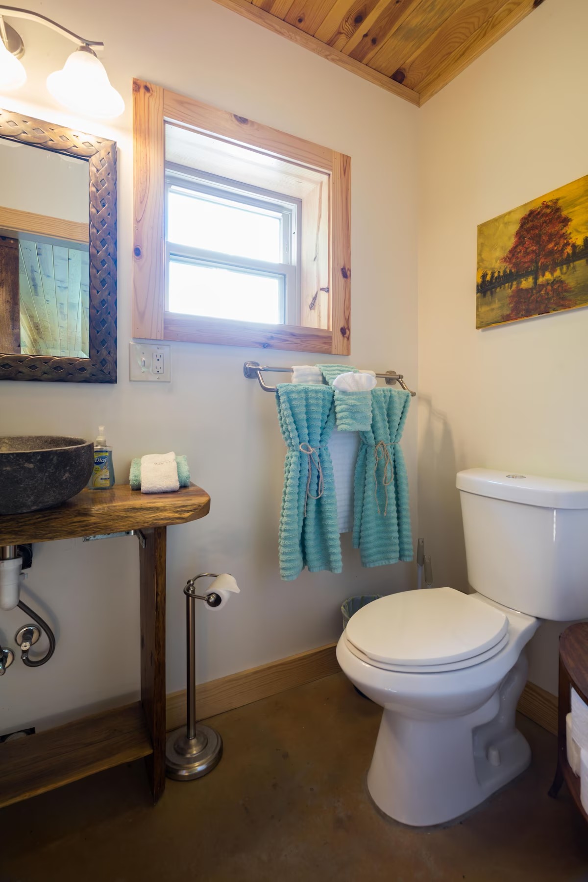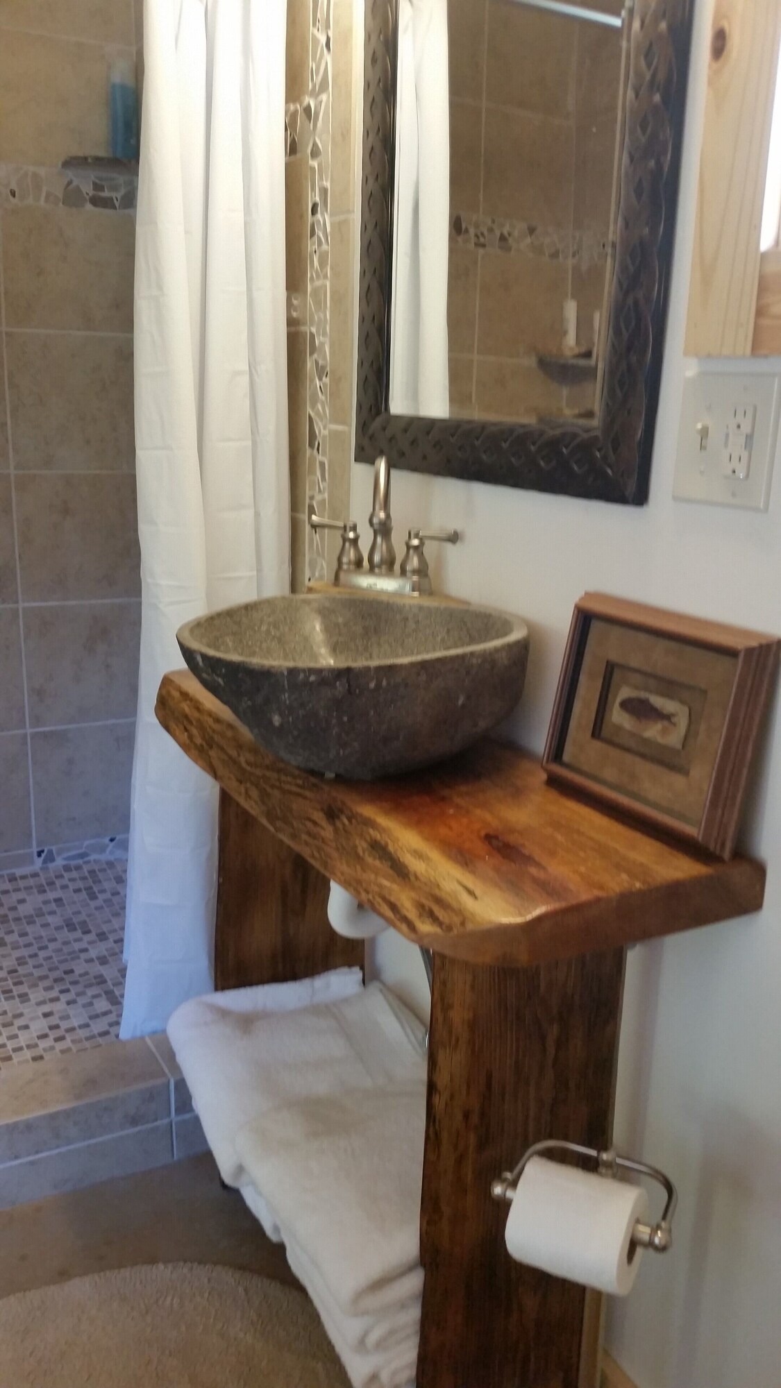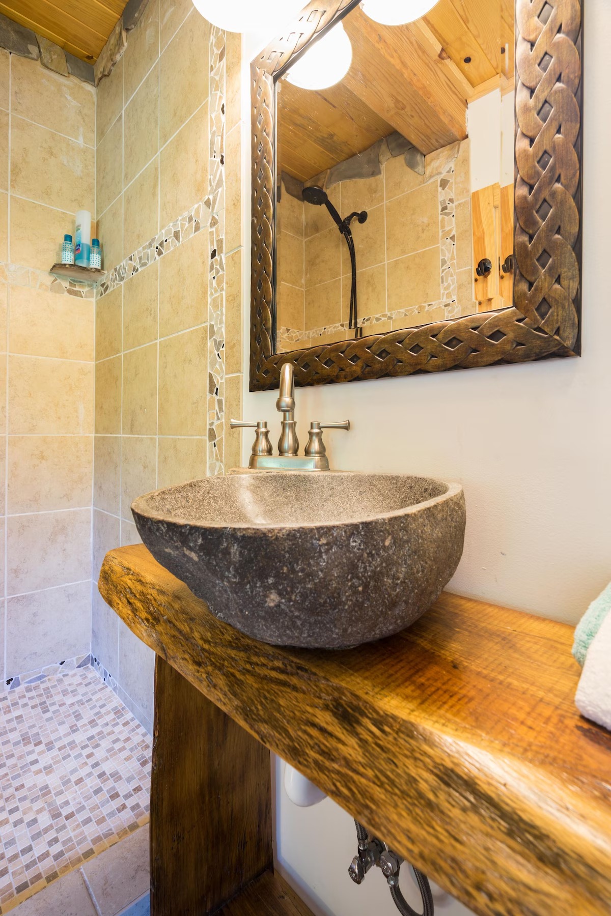 This hand-carved, artful cottage has a charming interior and large windows framing scenic views of Lookout Mountain. Inside, you'll find wood ceilings, a huge stone center wall, a full kitchen, and a spa-inspired bathroom with a stone sink and a large tile and stone shower. A queen size bed in the bedroom and a queen size sleeper sofa in the living room provide ample sleeping space for up to four guests. Outside there is a hot tub, fire pit and covered outdoor seating where you can hang out and enjoy the scenery.