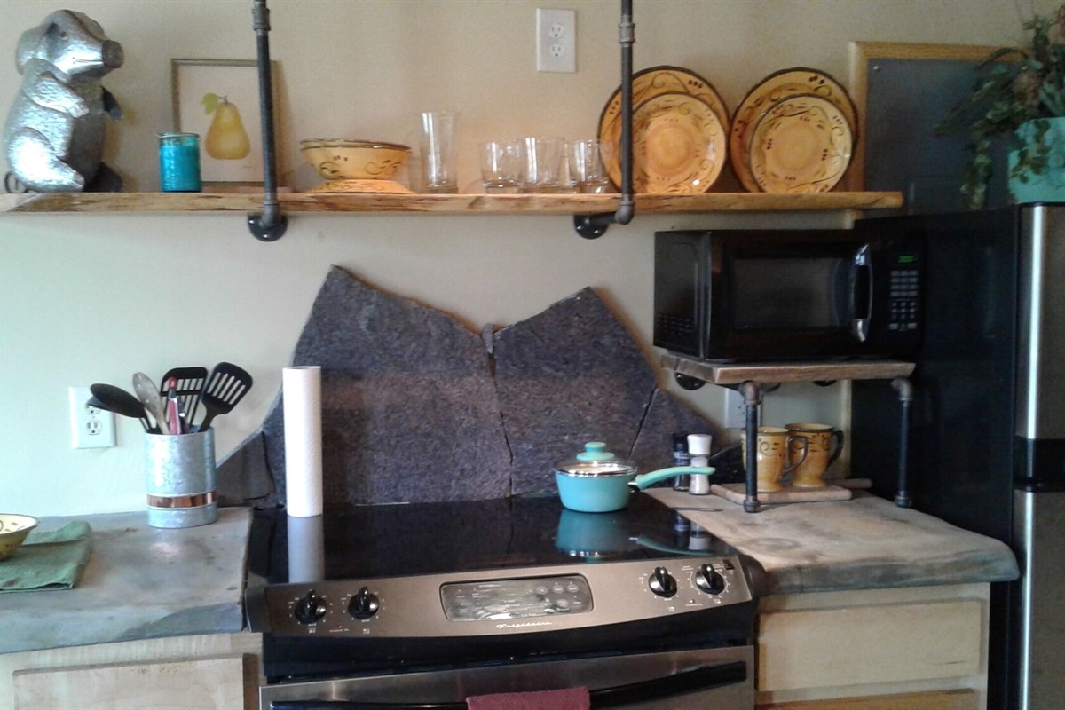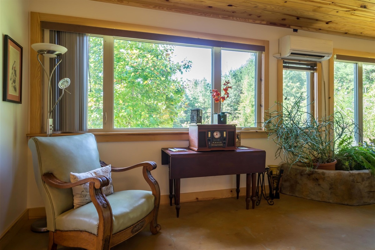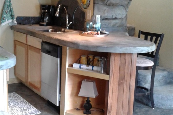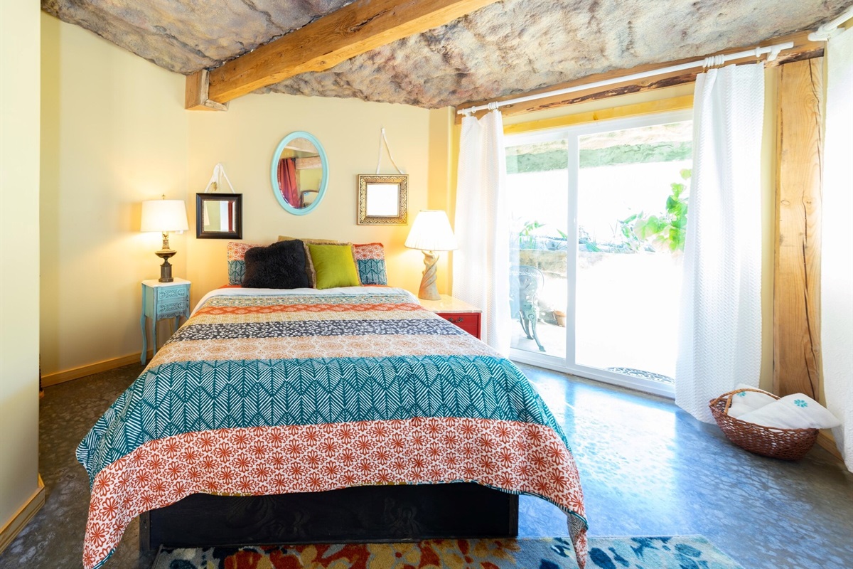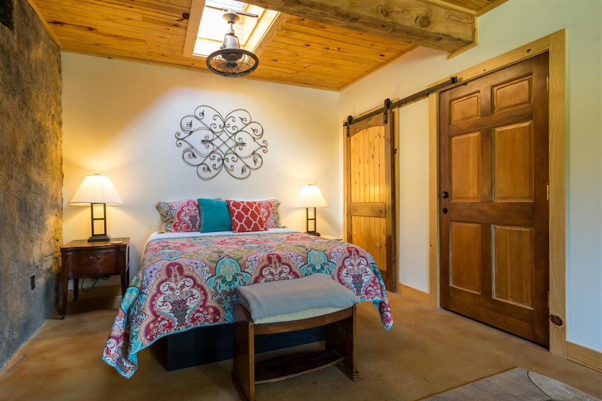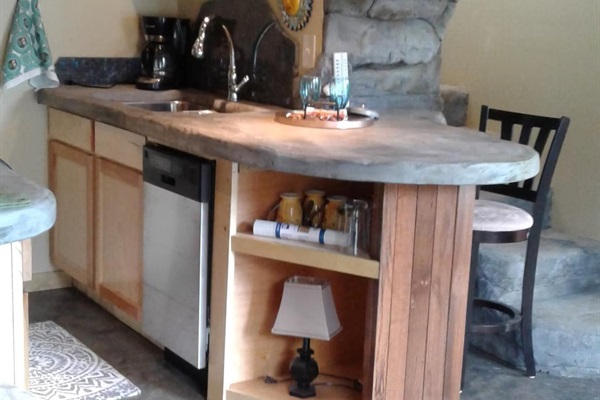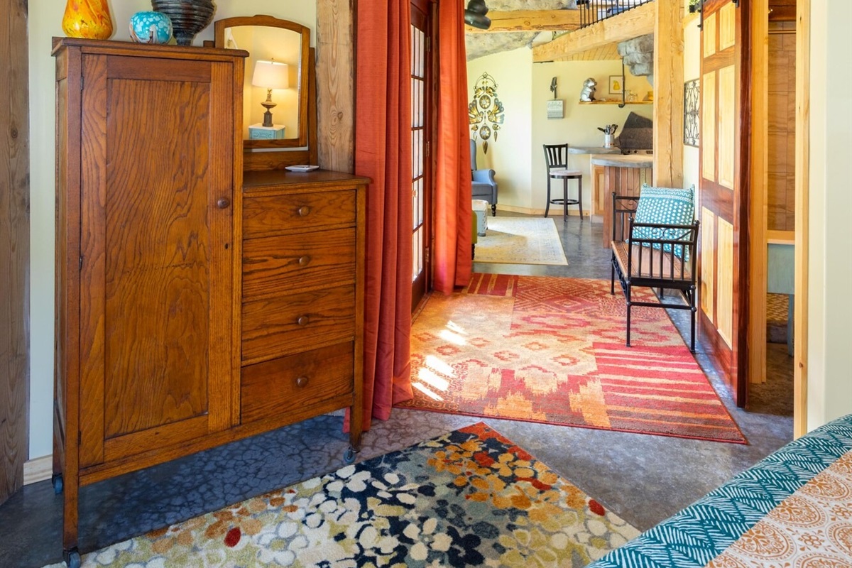On the main floor there is a full kitchen with concrete counters and dining bar, a sitting area with comfy chairs, a bathroom with a large tile shower and a bedroom with a queen bed and a private porch with a view of Lookout Mountain. Up the stone steps, you'll find a sweet bedroom loft with a full size bed and lots of windows with great views. Say hello to Tlaloc, the Aztec god of Rain and "that which sprouts" on the way up the steps.