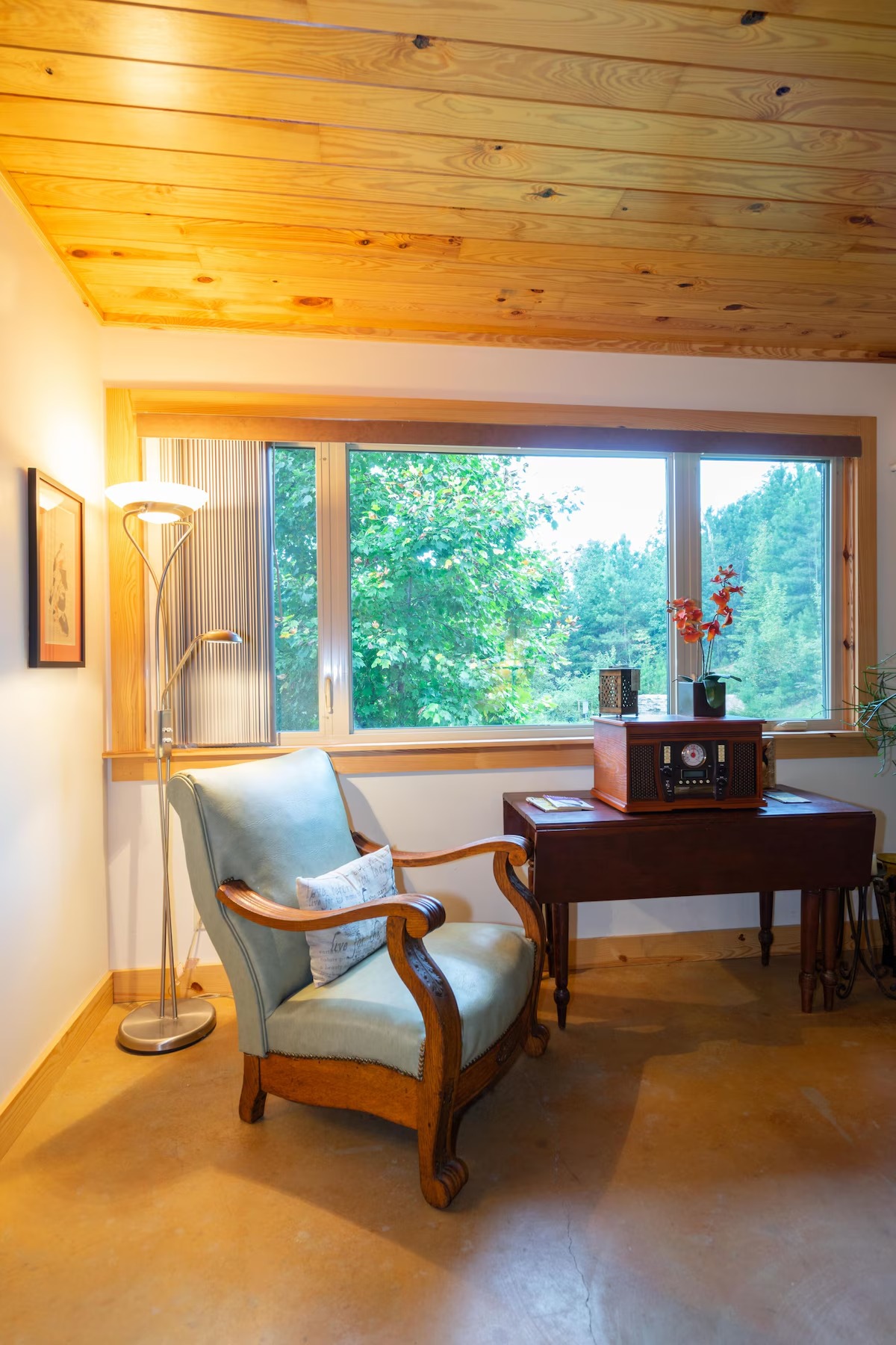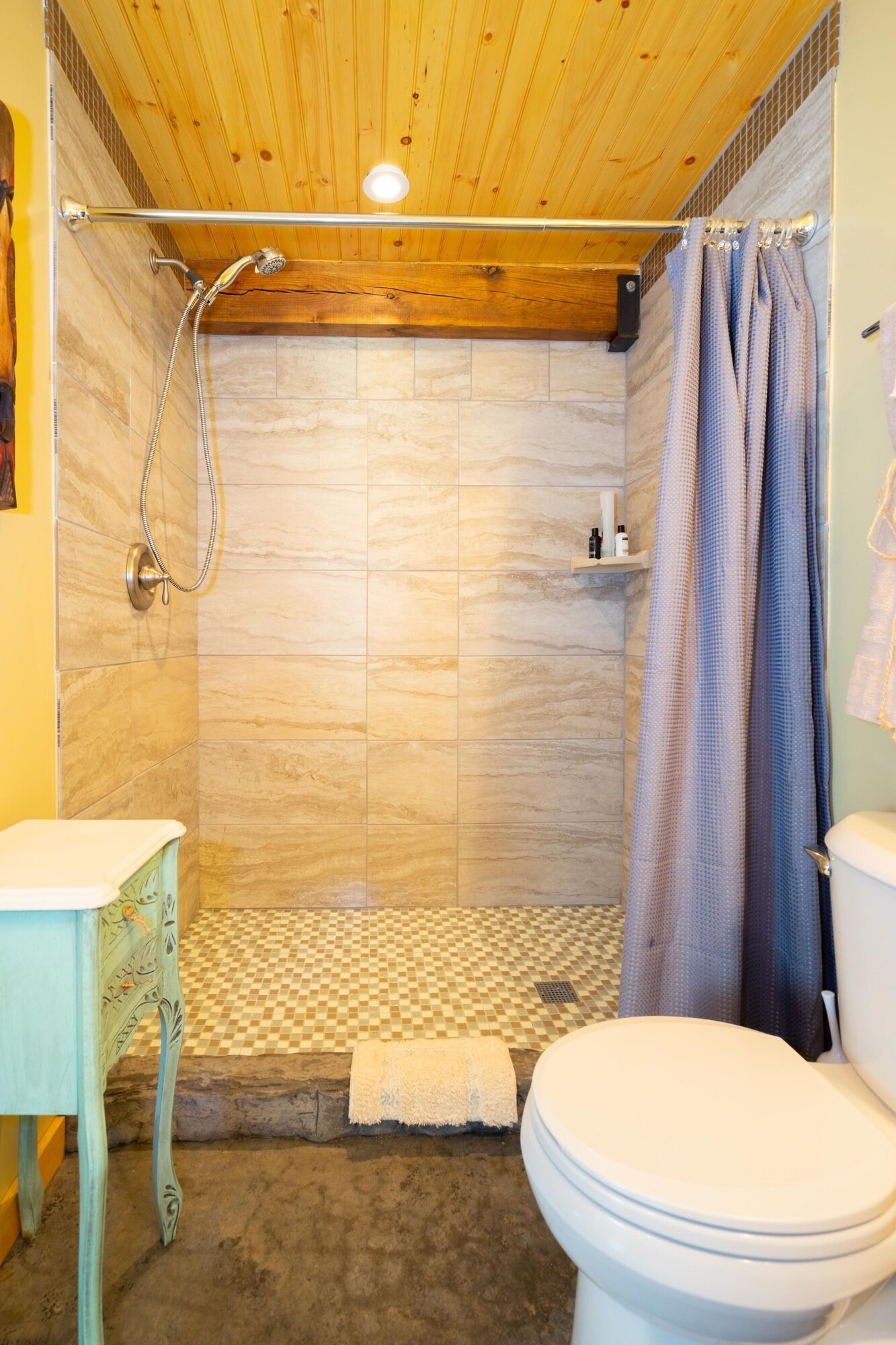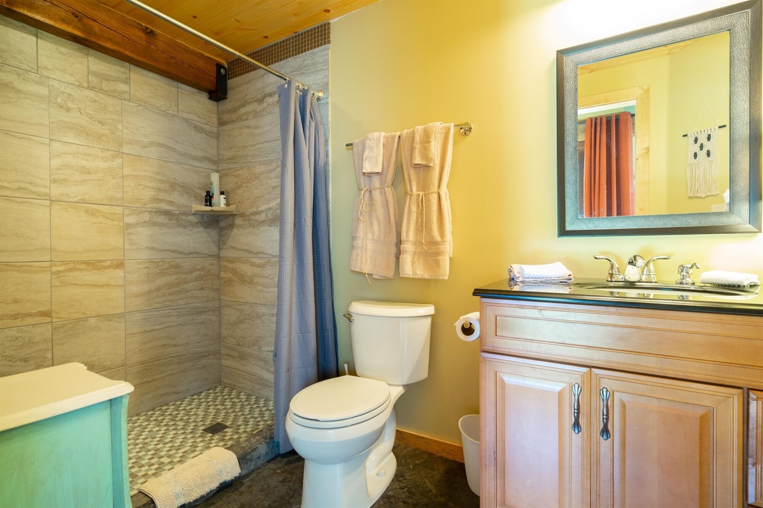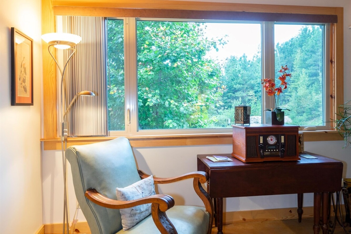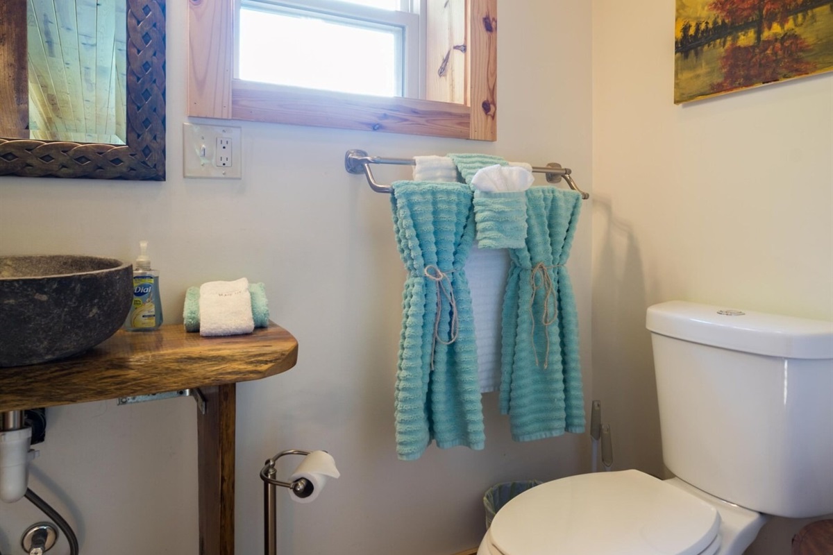 On the main floor there is a full kitchen with concrete counters and dining bar, a sitting area with comfy chairs, a bathroom with a large tile shower and a bedroom with a queen bed and a private porch with a view of Lookout Mountain. Up the stone steps, you'll find a sweet bedroom loft with a full size bed and lots of windows with great views. Say hello to Tlaloc, the Aztec god of Rain and "that which sprouts" on the way up the steps.
