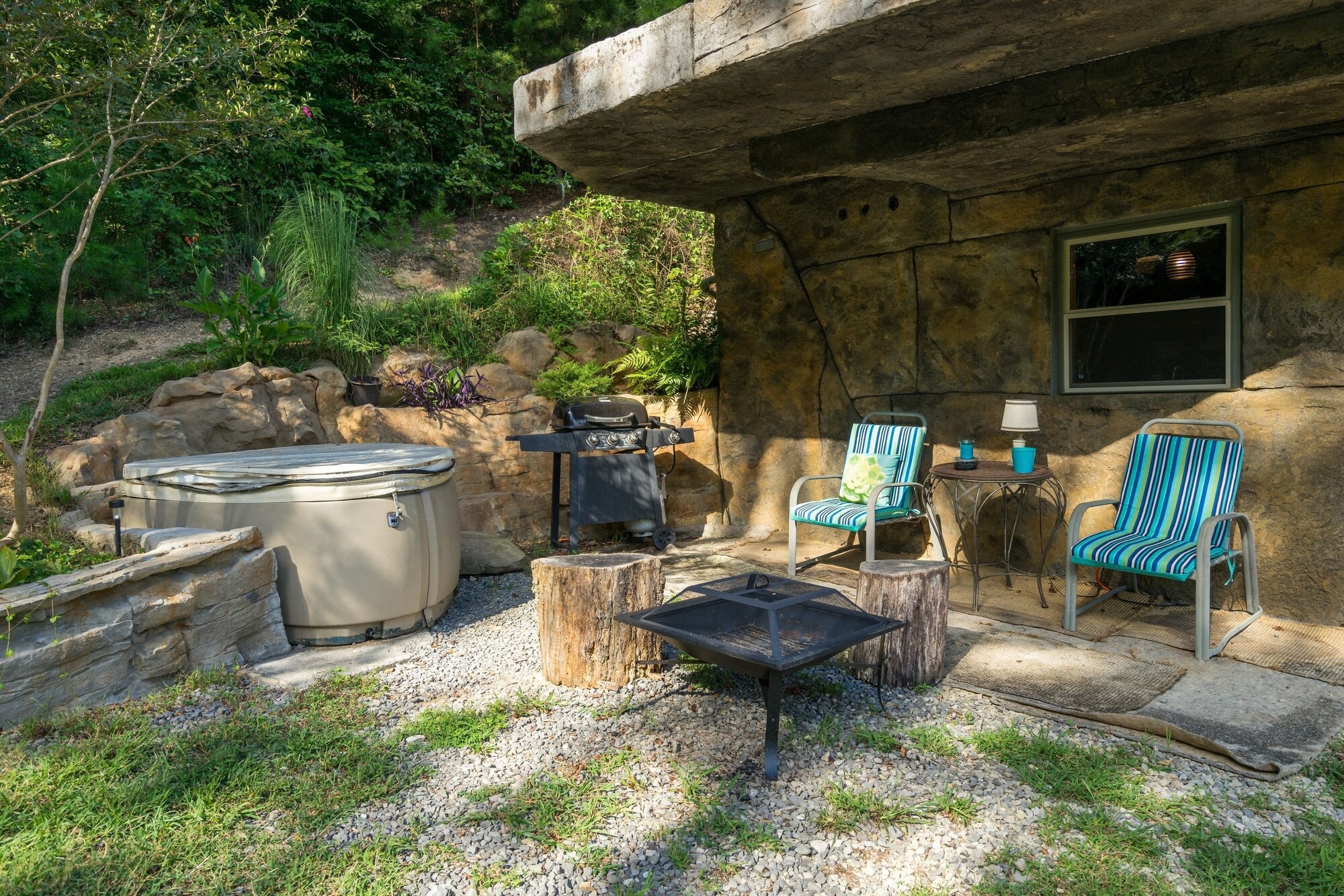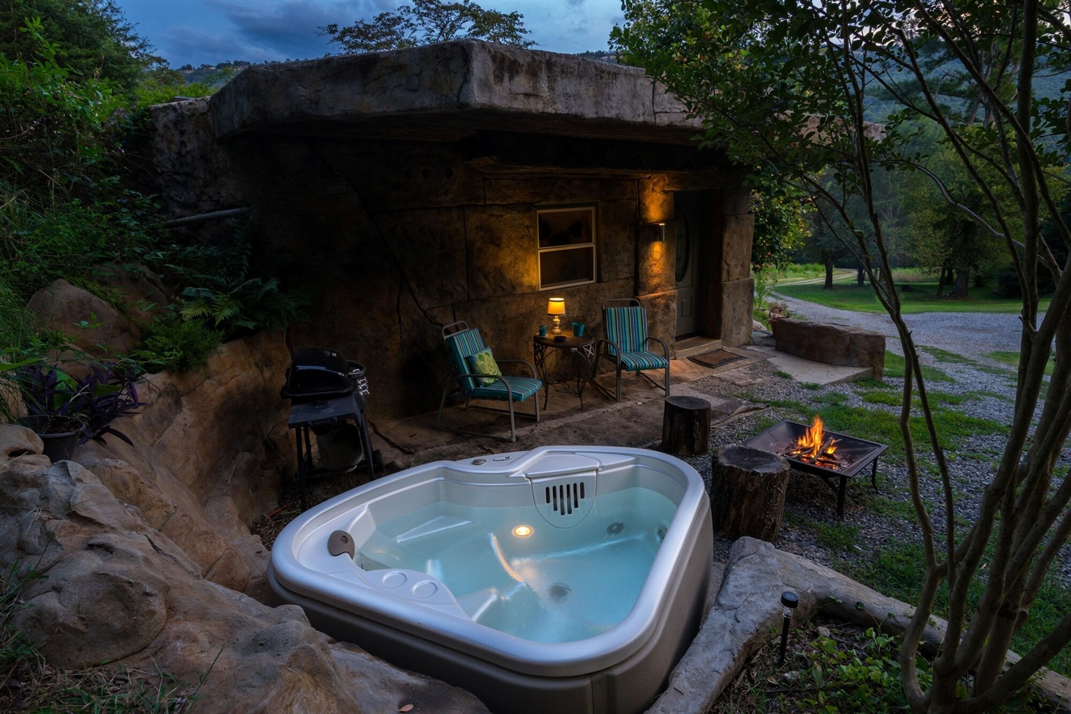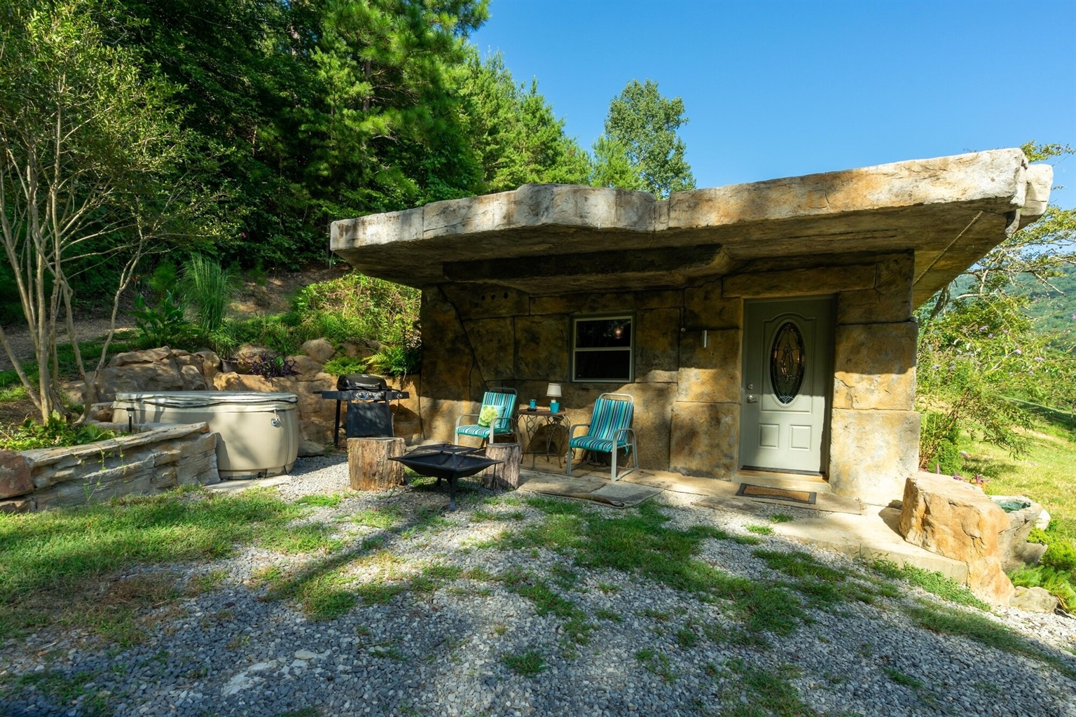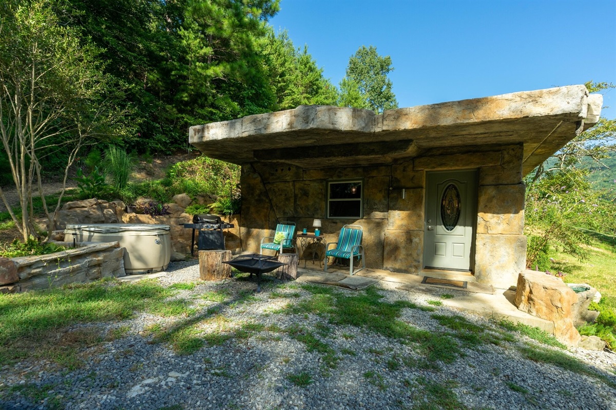 The Cavern on The Green is our second of two hand-carved, ruins style cottages. The other, the Bedrock Cave Cottage (vrbo# 971299) is next door. The two cottages sit in the middle of a twelve acre property and are situated such that each cottage has private areas outside. There is ample room for outdoor events and its a pretty sweet setup for an outdoor party with choice of bonfire sites.