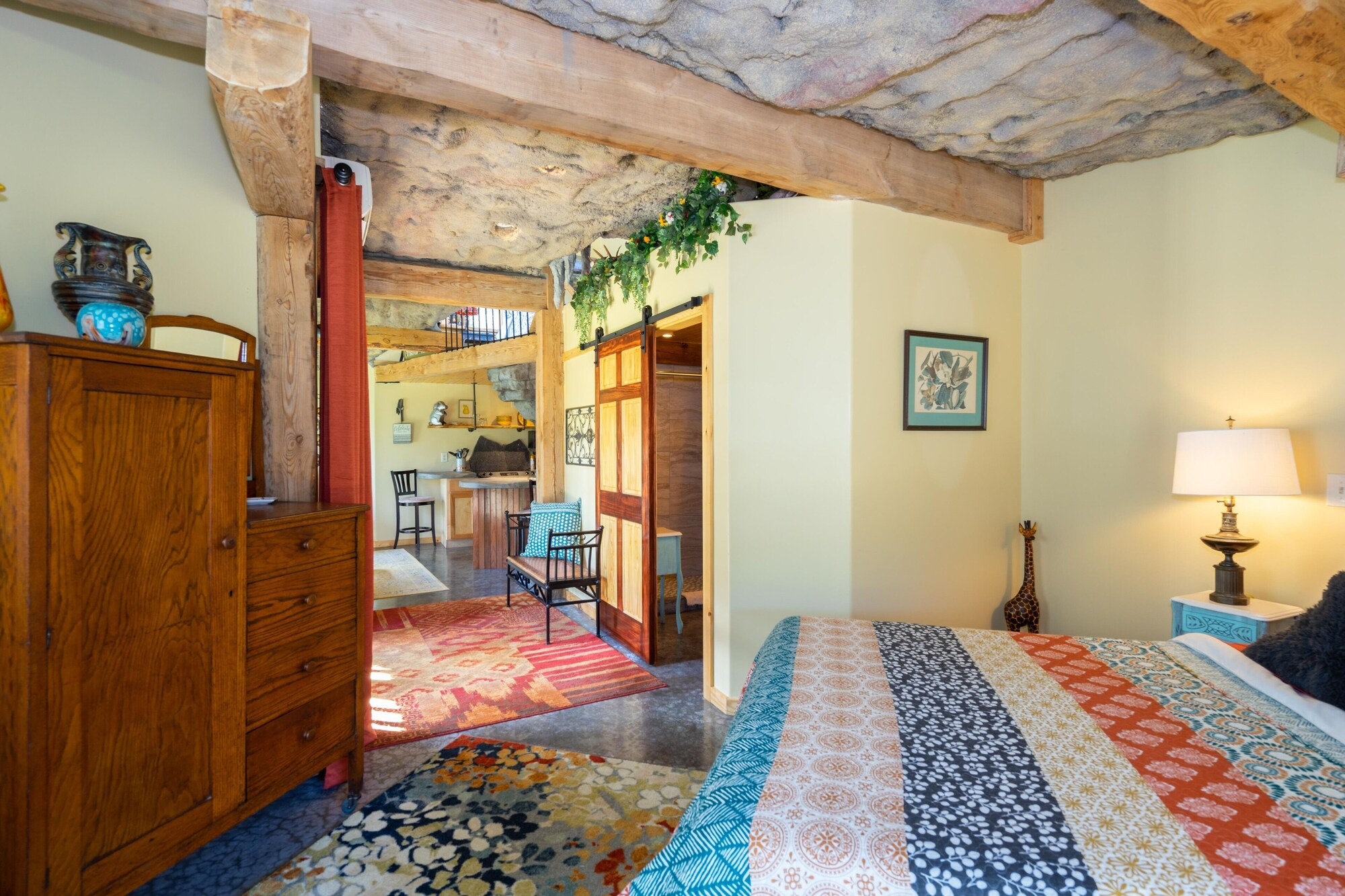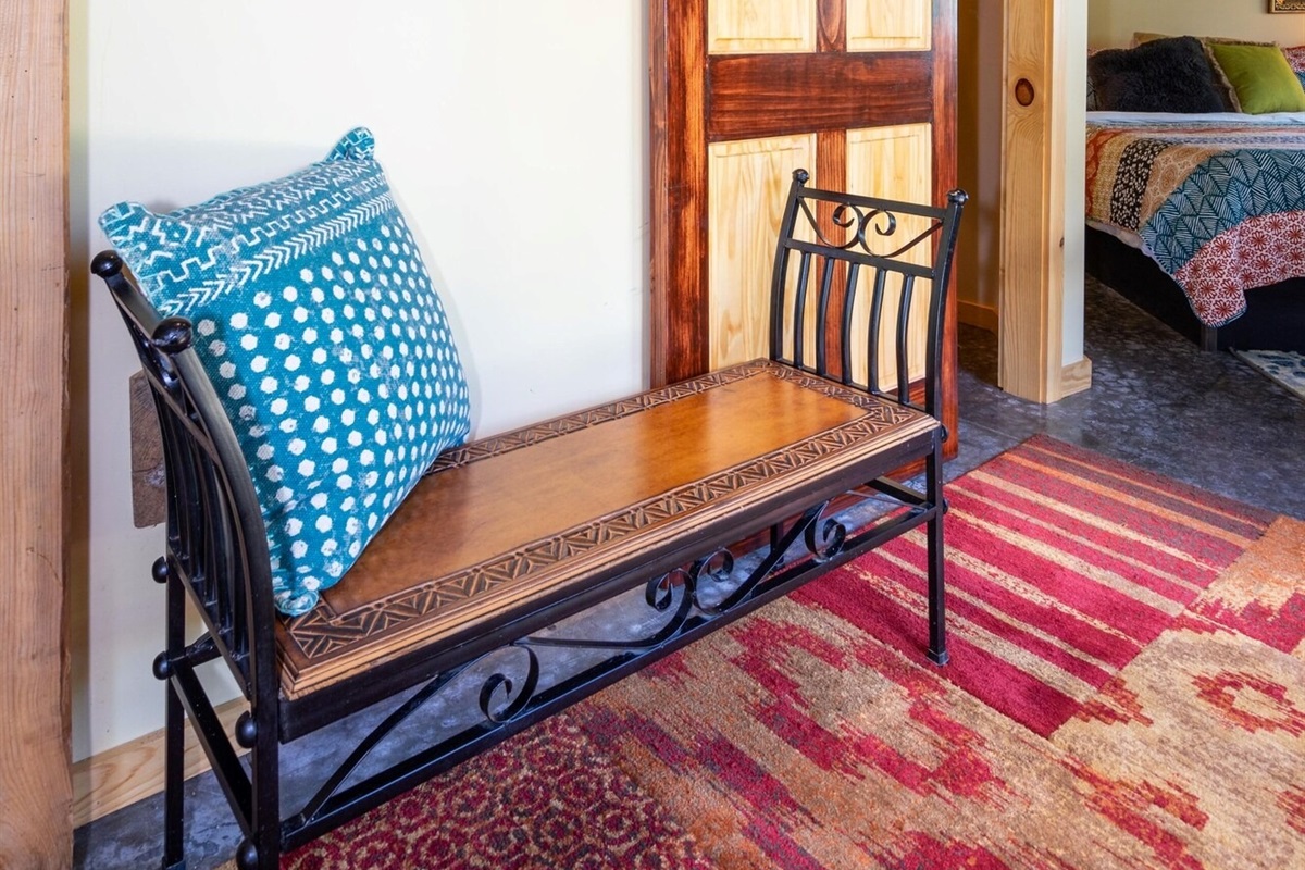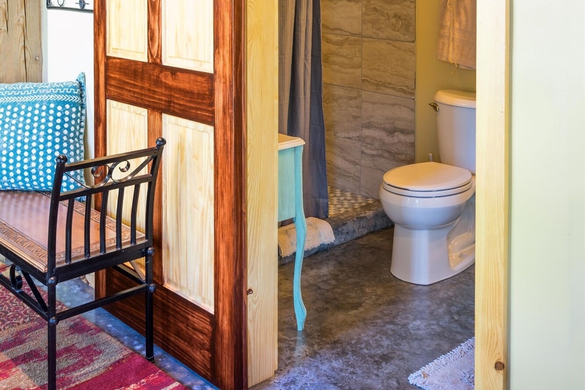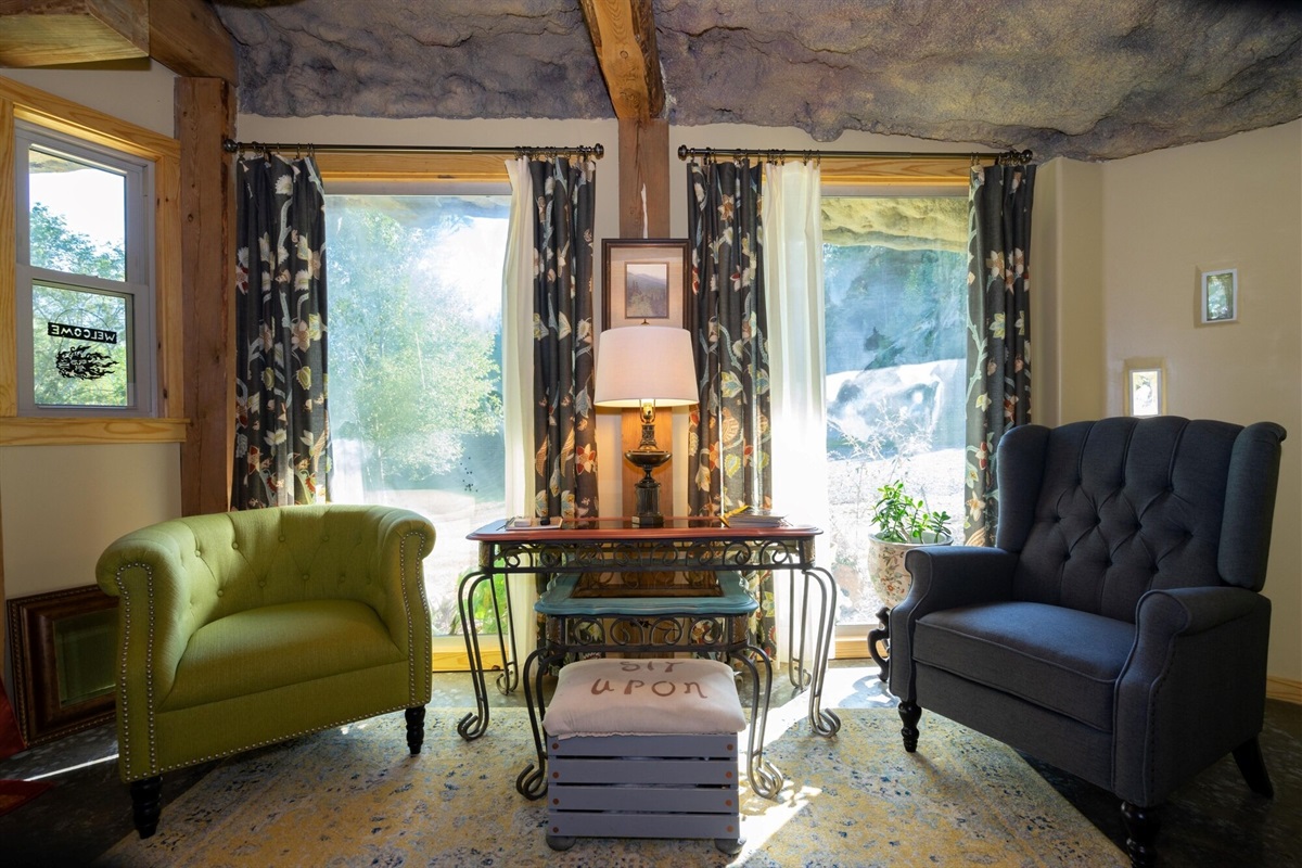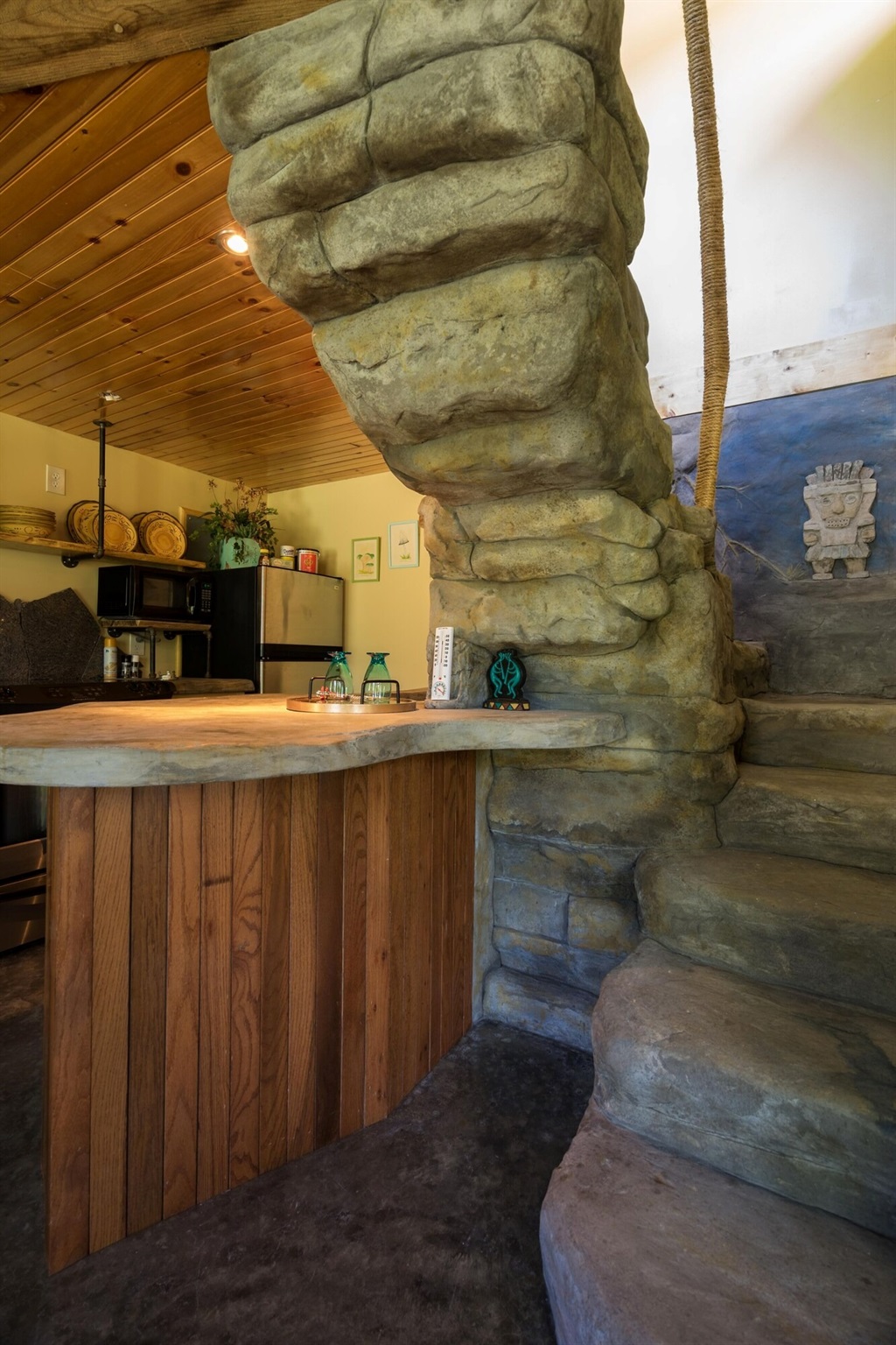On the main floor there is a full kitchen with concrete counters and dining bar, a sitting area with comfy chairs, a bathroom with a large tile shower and a bedroom with a queen bed and a private porch with a view of Lookout Mountain. Up the stone steps, you'll find a sweet bedroom loft with a full size bed and lots of windows with great views. Say hello to Tlaloc, the Aztec god of Rain and "that which sprouts" on the way up the steps.