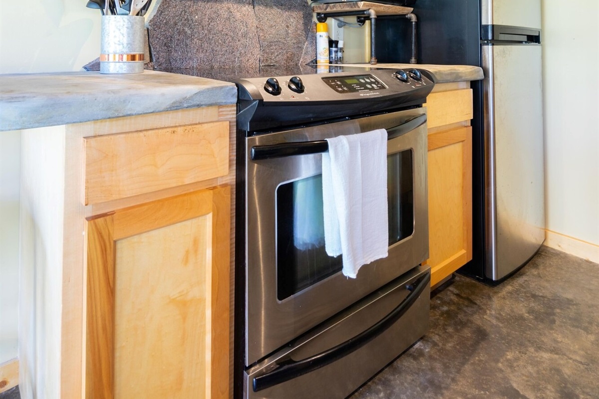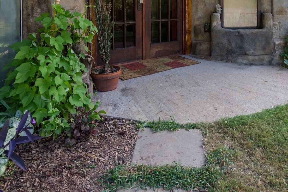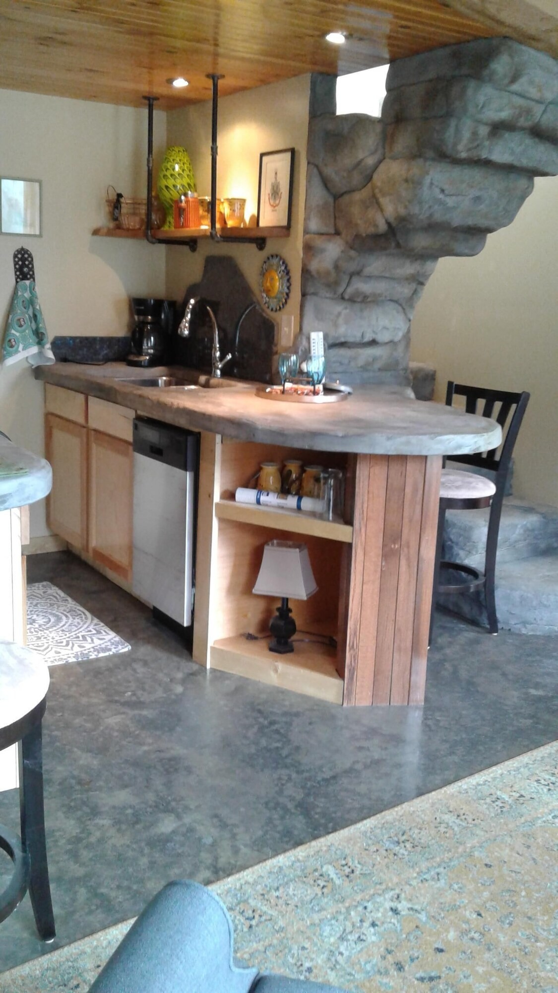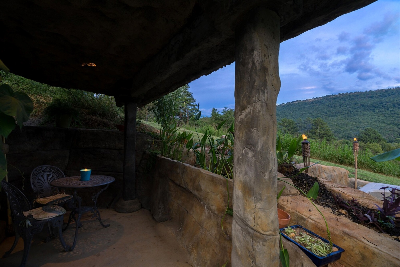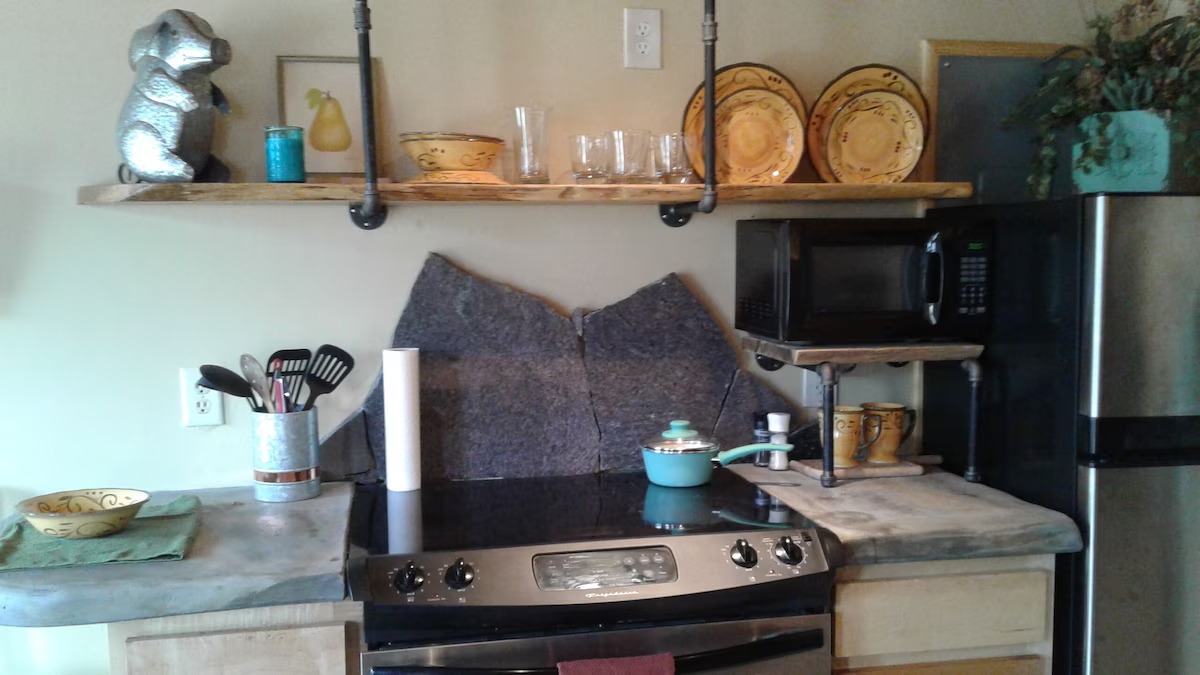 On the main floor there is a full kitchen with concrete counters and dining bar, a sitting area with comfy chairs, a bathroom with a large tile shower and a bedroom with a queen bed and a private porch with a view of Lookout Mountain. Up the stone steps, you'll find a sweet bedroom loft with a full size bed and lots of windows with great views. Say hello to Tlaloc, the Aztec god of Rain and "that which sprouts" on the way up the steps.