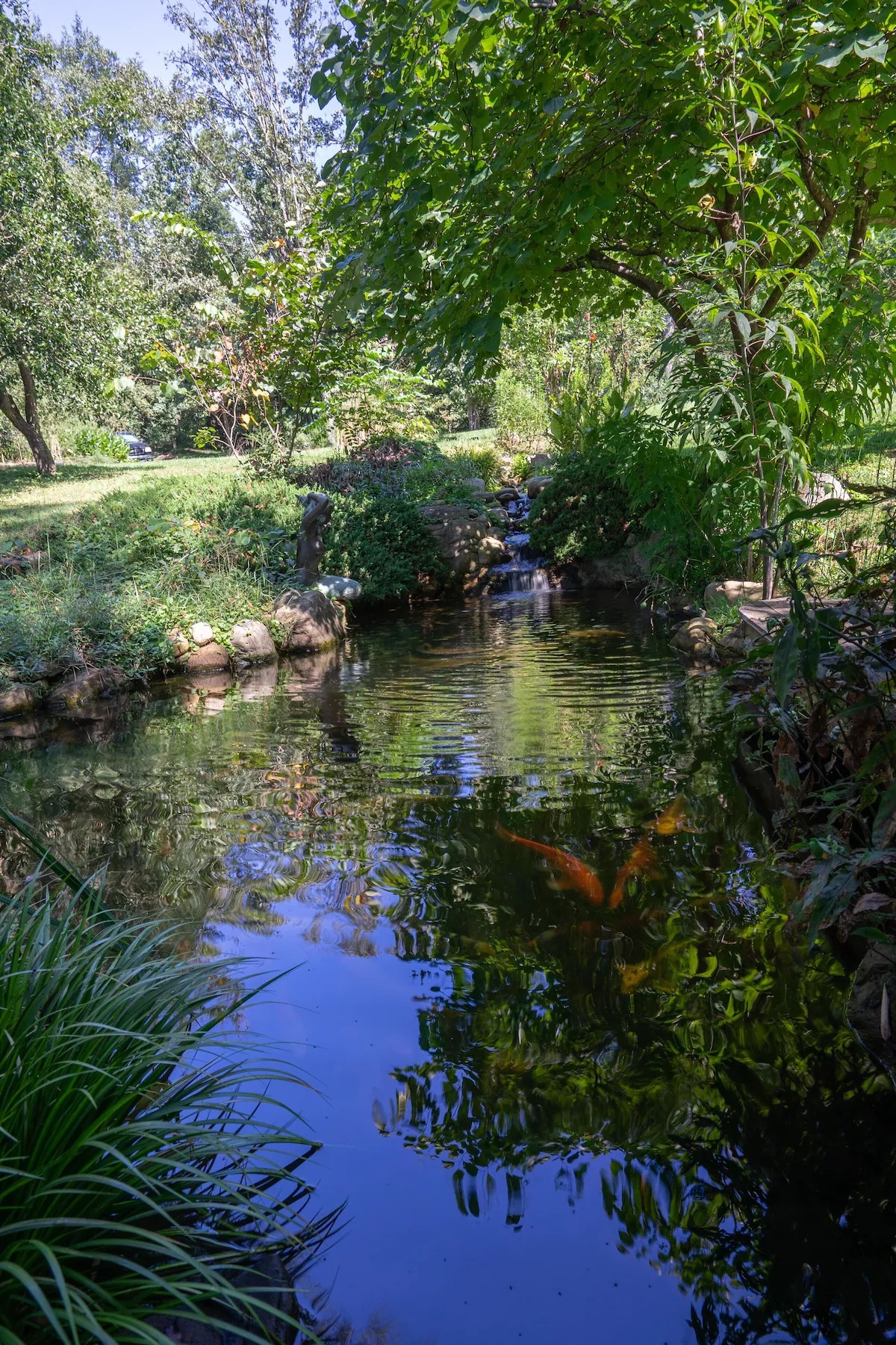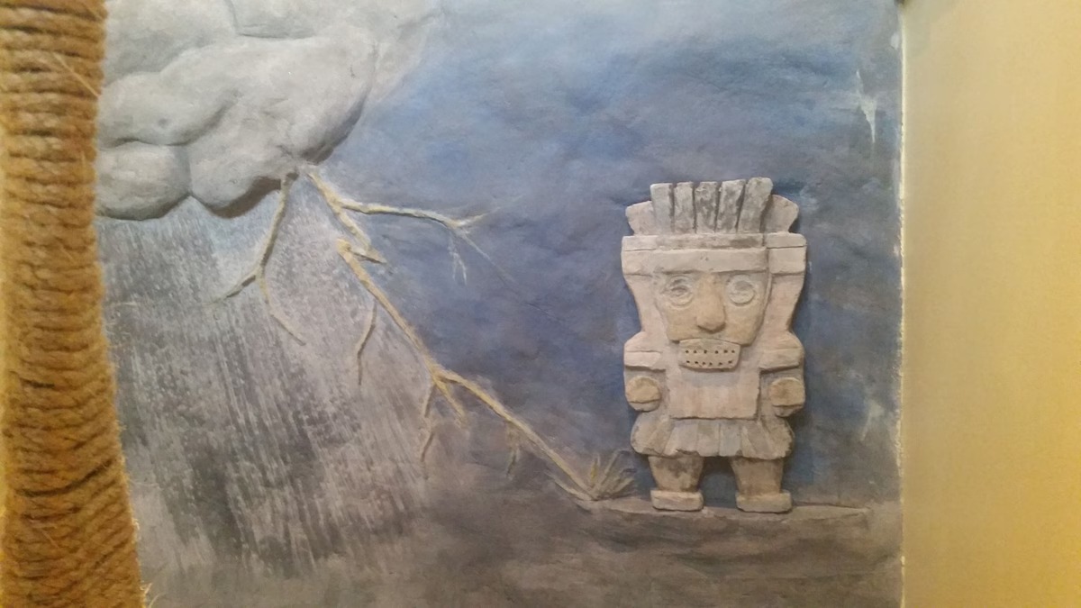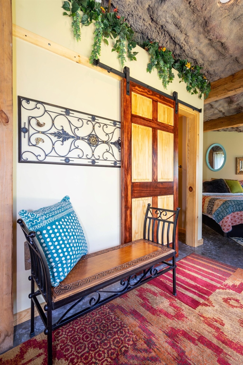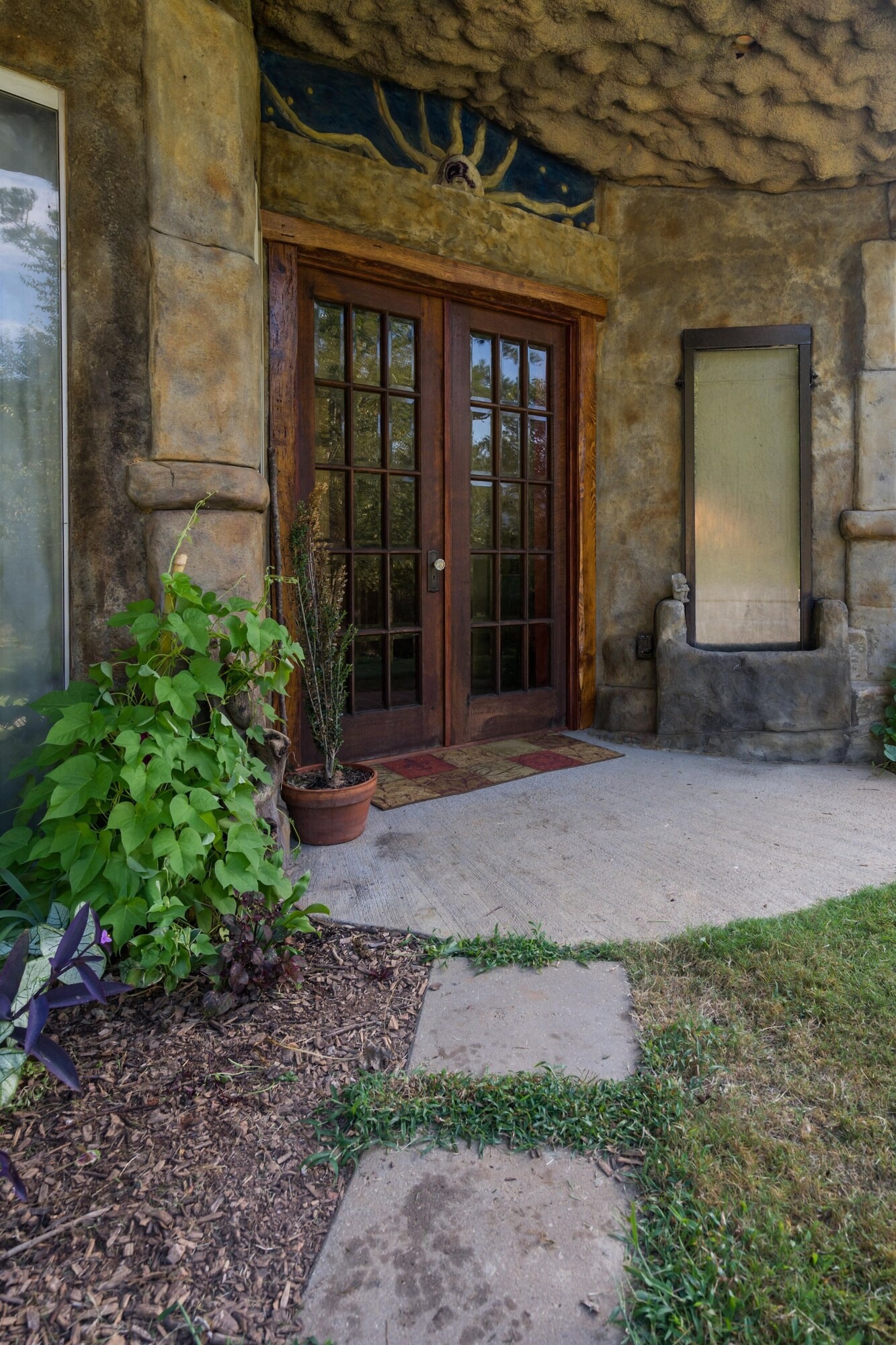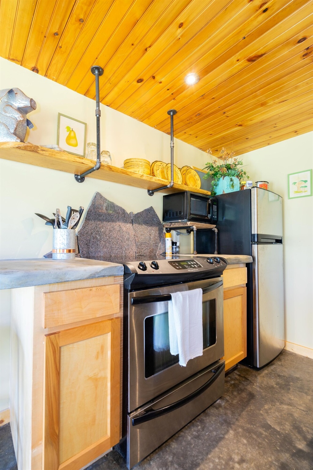 On the main floor there is a full kitchen with concrete counters and dining bar, a sitting area with comfy chairs, a bathroom with a large tile shower and a bedroom with a queen bed and a private porch with a view of Lookout Mountain. Up the stone steps, you'll find a sweet bedroom loft with a full size bed and lots of windows with great views. Say hello to Tlaloc, the Aztec god of Rain and "that which sprouts" on the way up the steps.